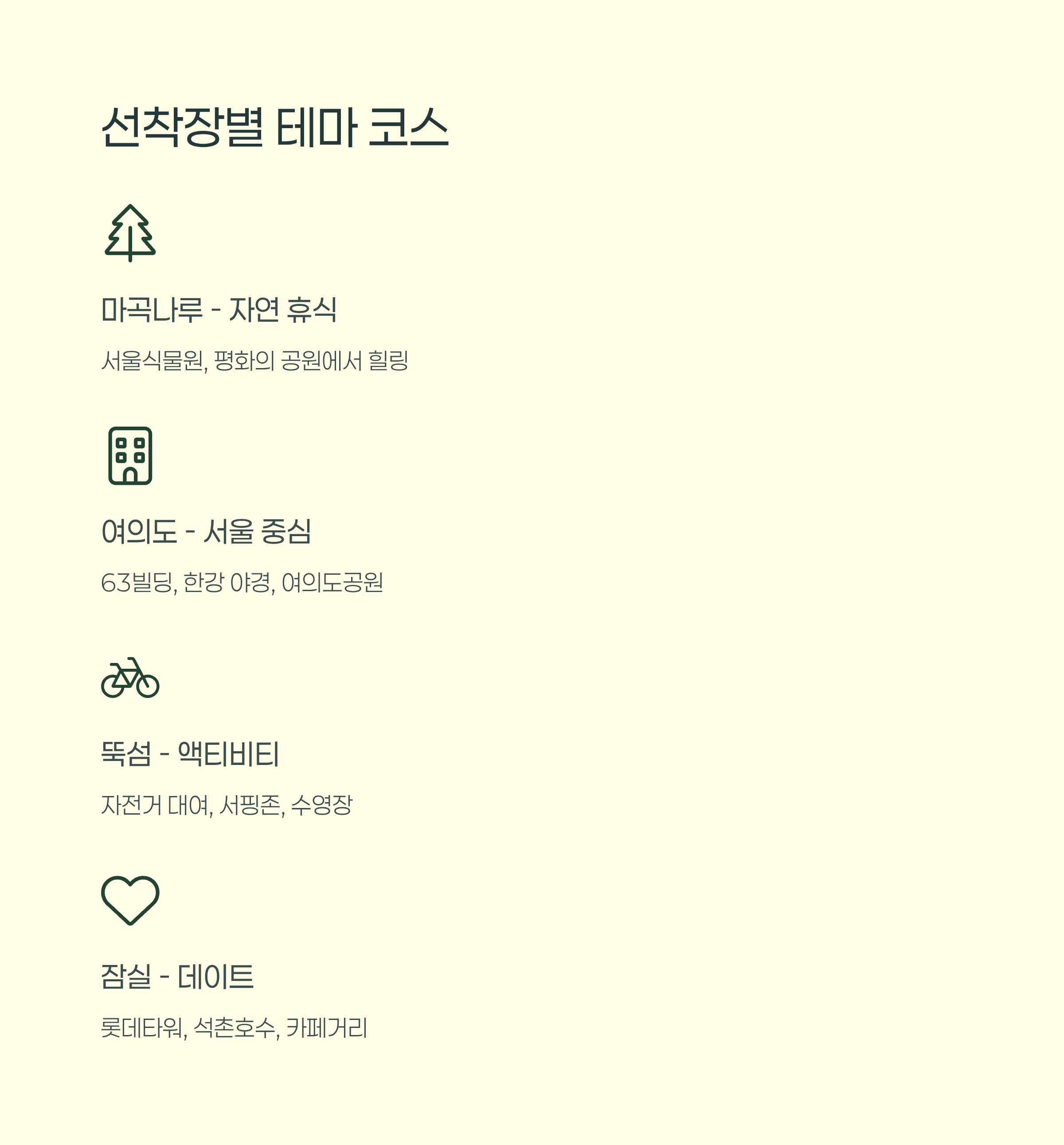 | 마곡나루 | 자연 속 휴식 | 서울식물원, 평화의 공원 |