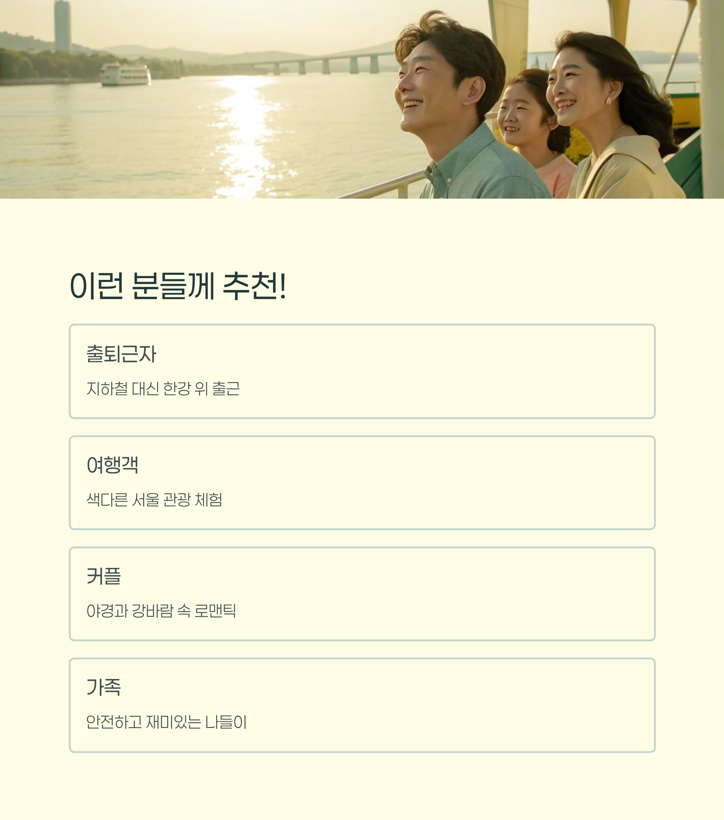 단순 이동이 아닌, 한강 여행을 만들어줄 수 있는 테마를 소개할게요.