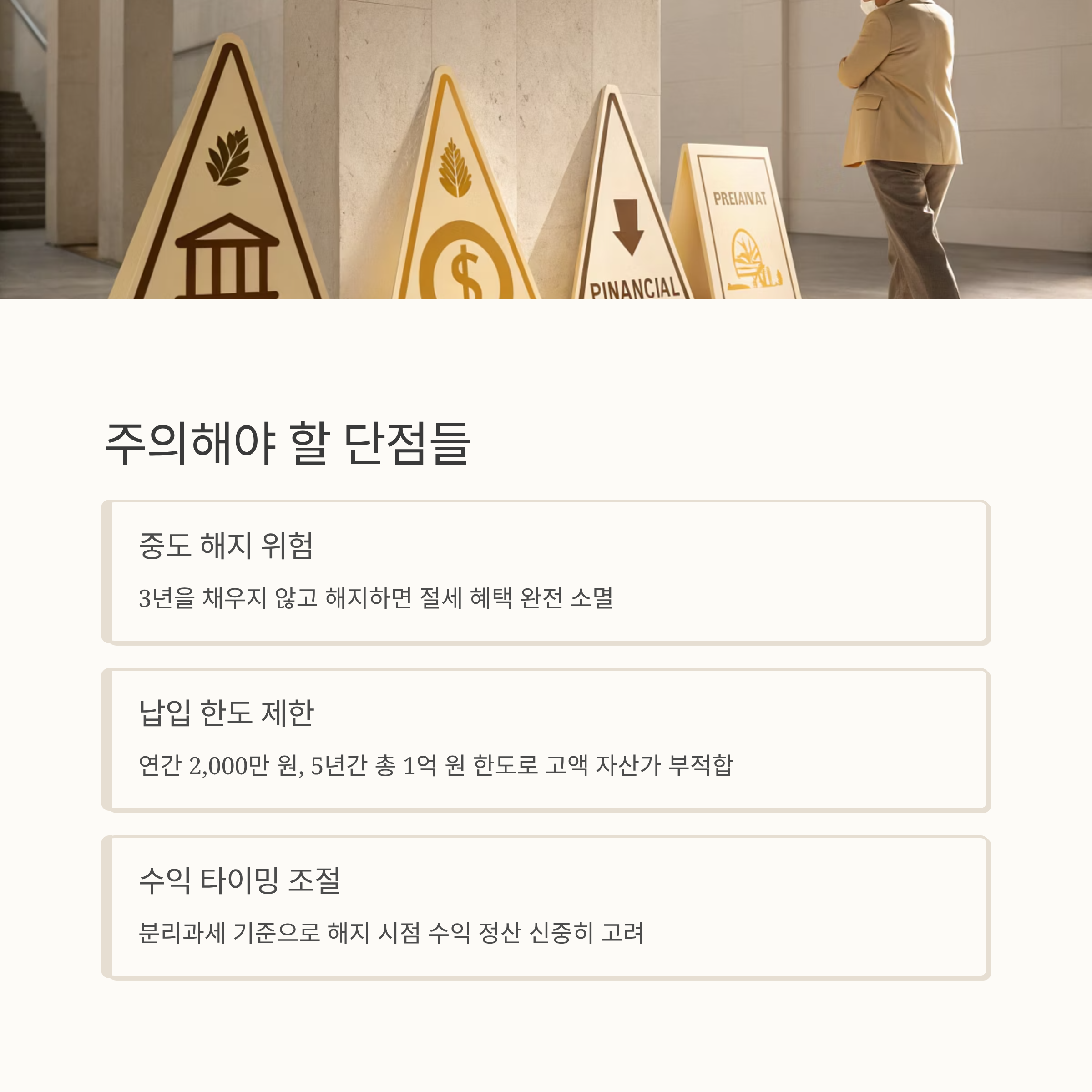 5년간 총 1억 원 한도가 있어 고액 자산가는 적합하지 않을 수 있어요. - 수익 실현 타이밍 조절 필요