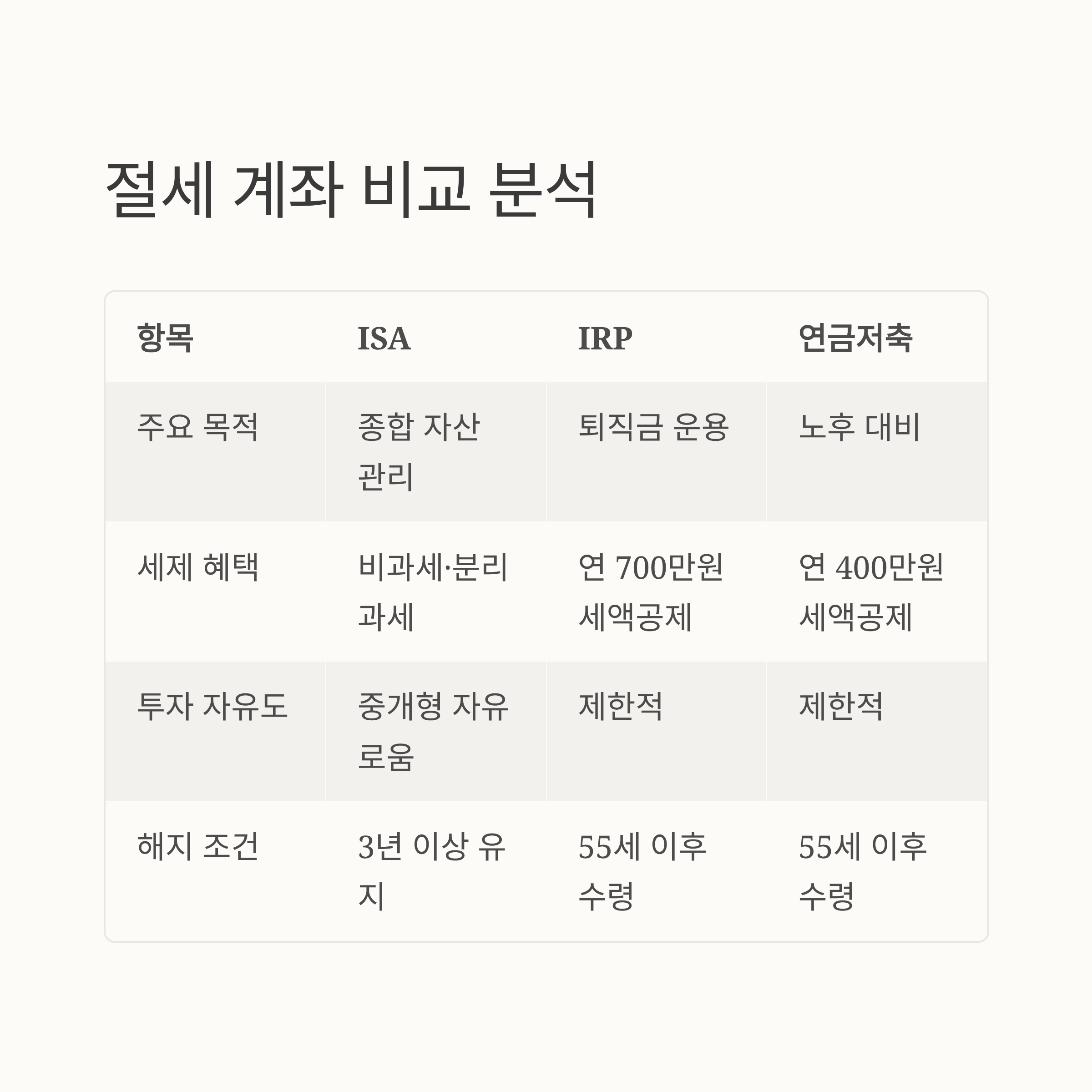 | 세제 혜택 | 비과세 및 분리과세 | 연 700만 원까지 세액공제 | 연 400만 원 세액공제 |