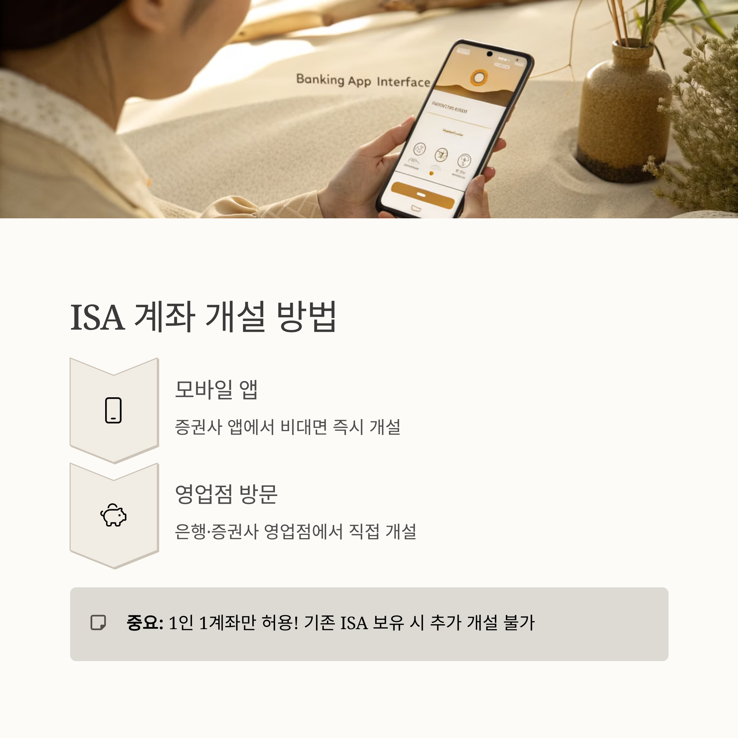 ISA 계좌는 은행·증권사 모바일 앱 또는 영업점에서 개설할 수 있어요.