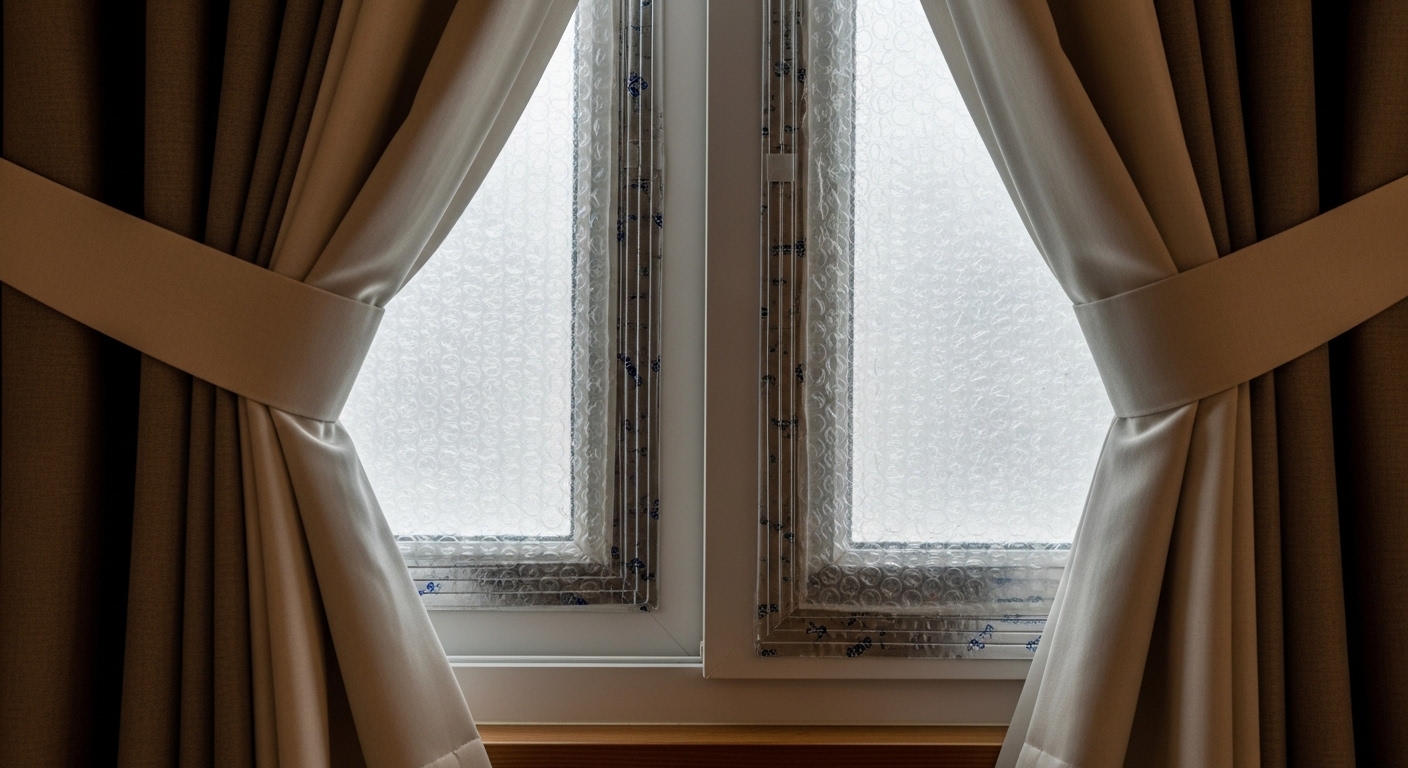 창문에 뽁뽁이 붙이고 문풍지 설치하면 열 손실을 최대 30%까지 줄일 수 있어요.