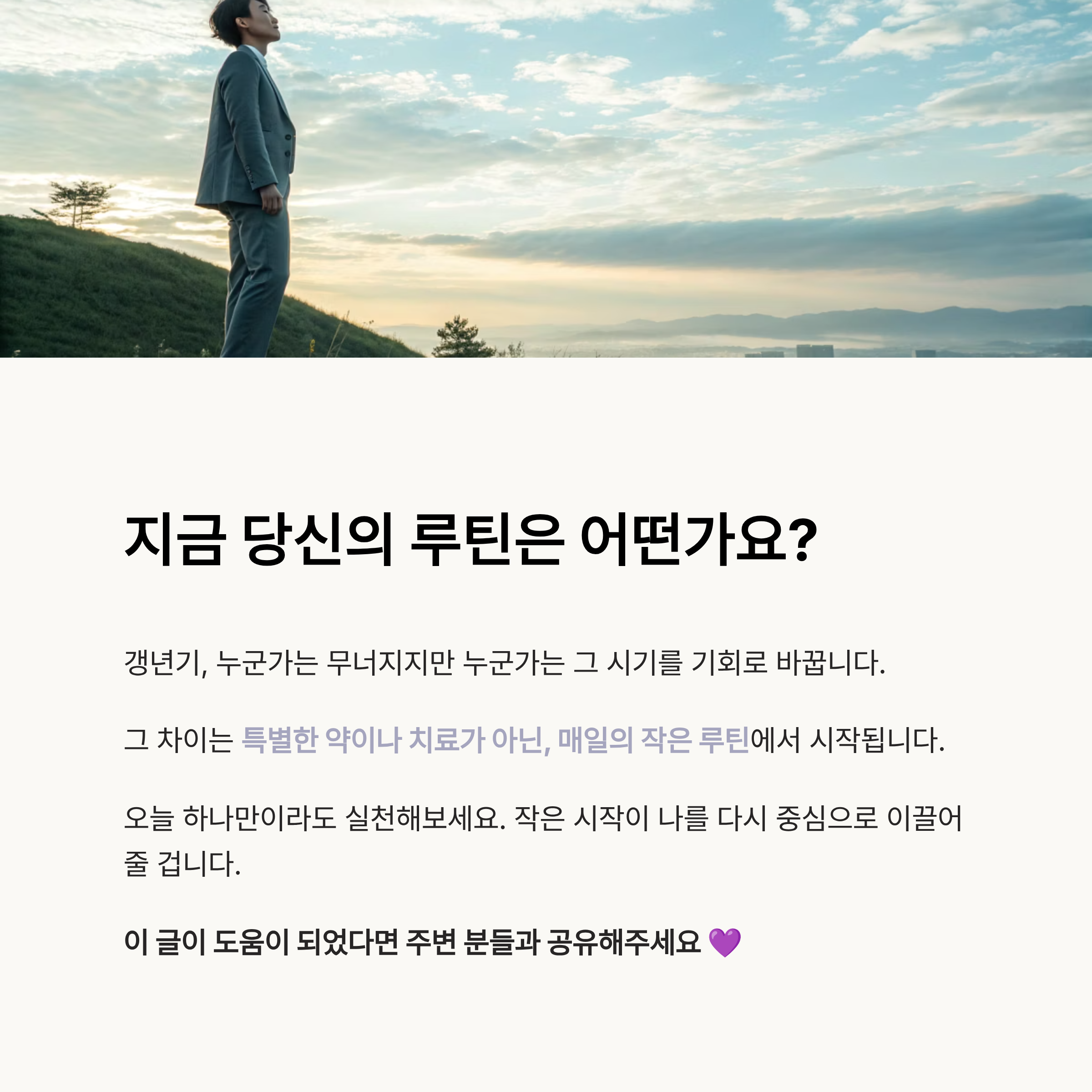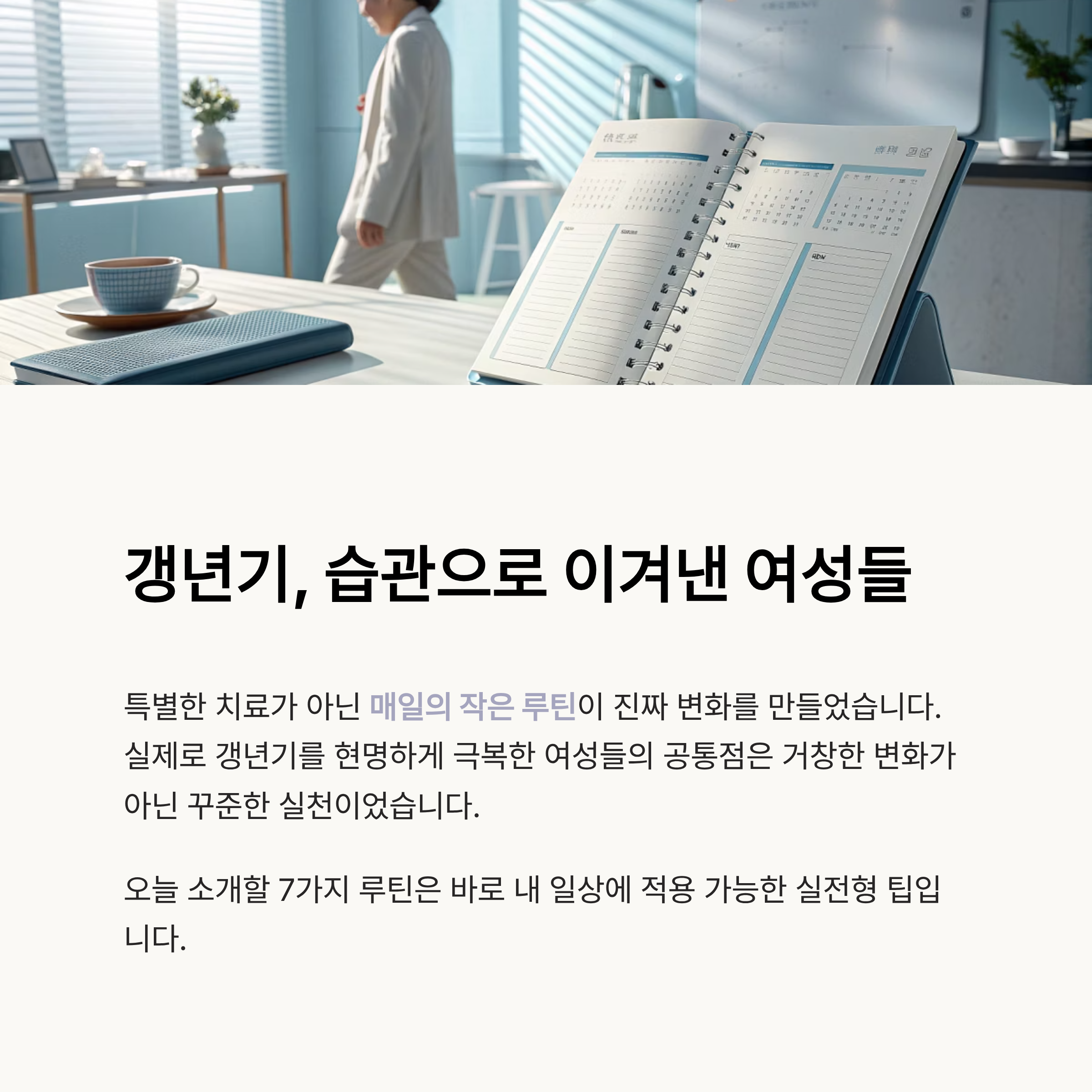 실제로 갱년기를 현명하게 극복한 여성들은 누구나 ‘특별한 루틴’ 하나쯤은 가지고 있었습니다.