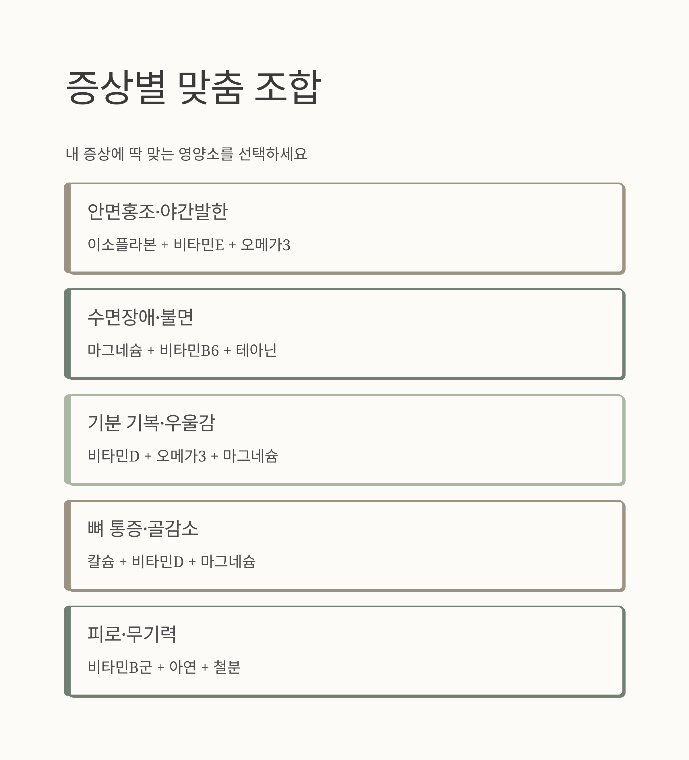 | 기분 기복/우울감 | 비타민D + 오메가3 + 마그네슘 |