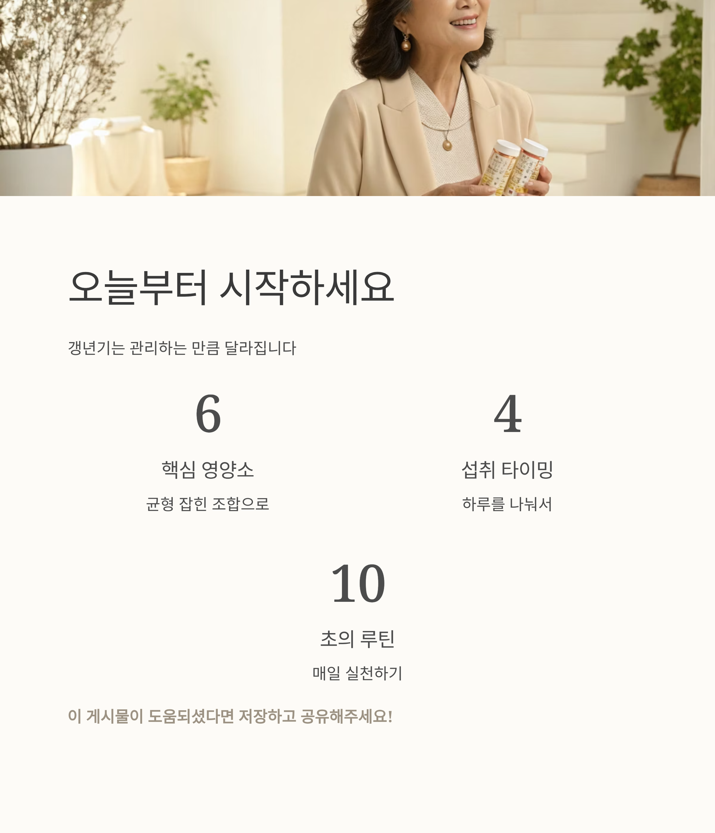지금부터, 갱년기 여성에게 꼭 필요한 영양소와 똑똑한 섭취 조합을 총정리해드릴게요.