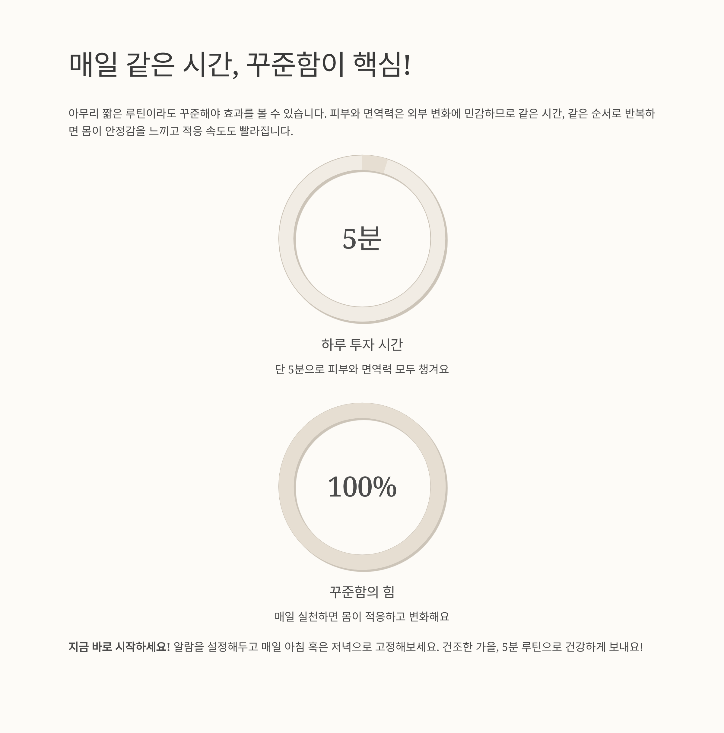 가을이 되면 찬바람과 함께 피부는 푸석해지고 몸은 자꾸 피곤해집니다. 아침저녁 쌀쌀한 날씨와 건조한 공기에 피부도 면역력도 모두 예민해지기 쉬운데요. 매일 5분만 투자하면 피부 보습은 물론 면역력까지 자연스럽게 챙길 수 있는 루틴이 있습니다. 복잡하지 않지만 효과적인 방법, 지금 바로 소개합니다.