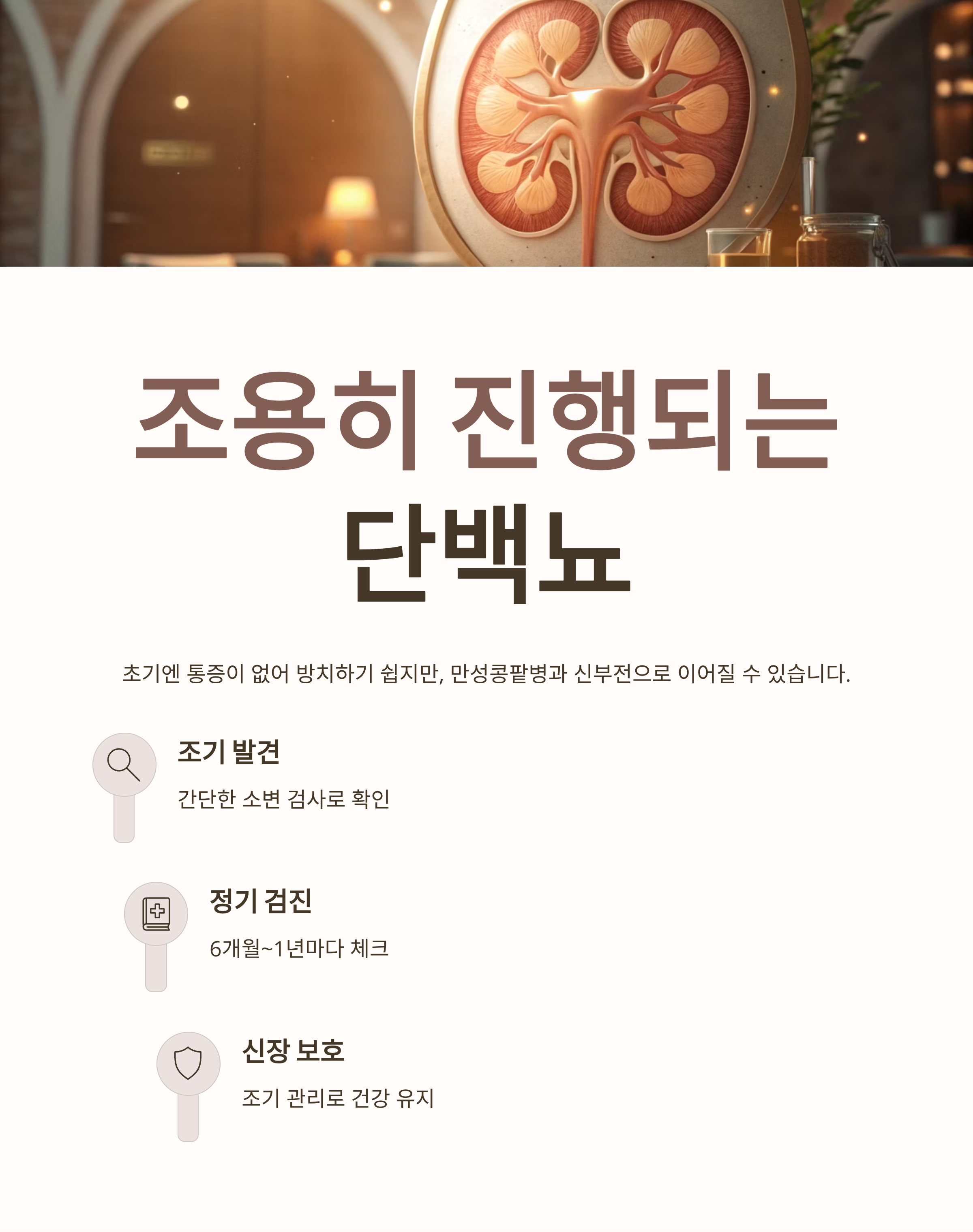 단백뇨가 무서운 이유는 바로 '조용하게' 진행된다는 점입니다.