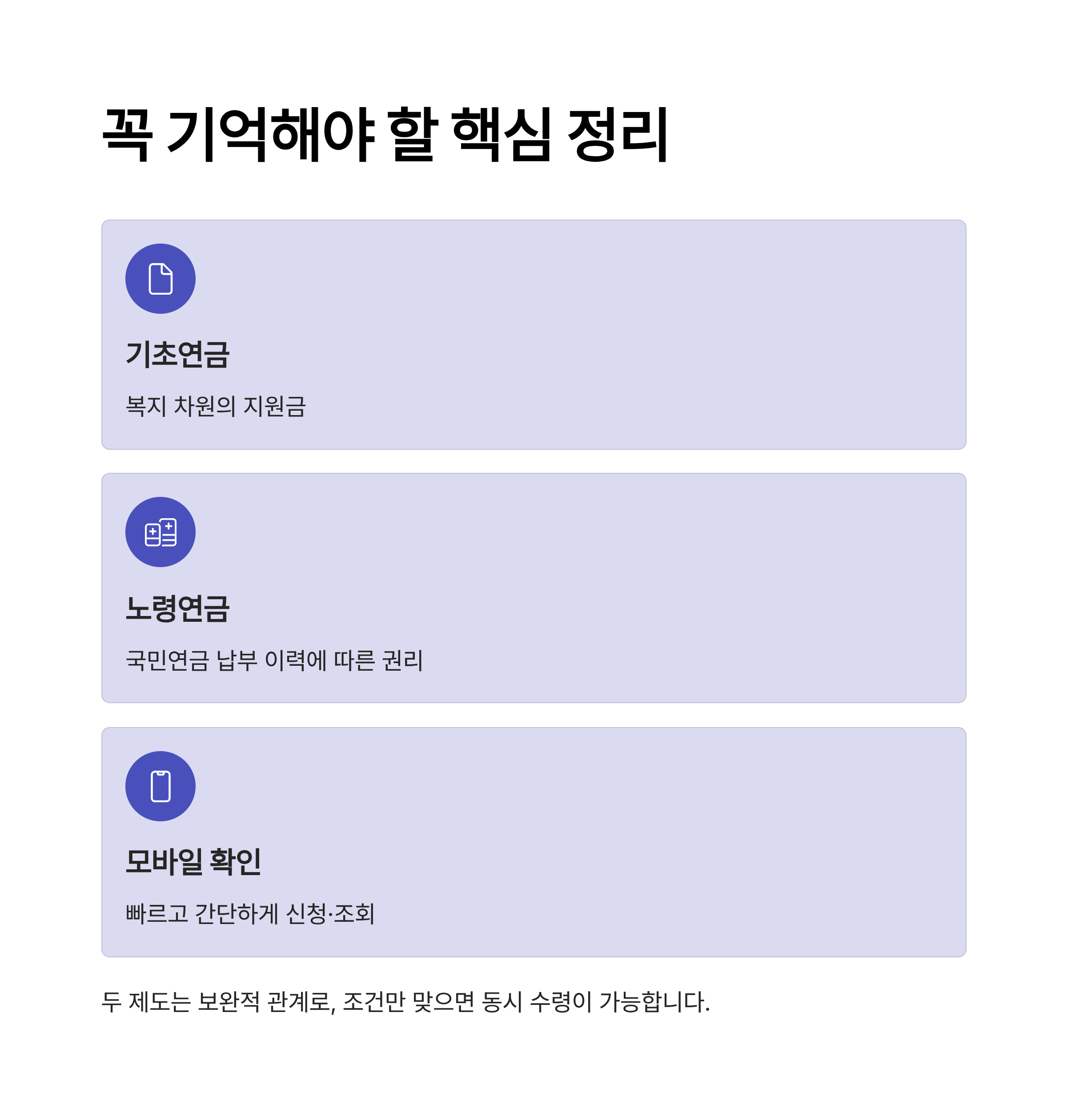 기초연금은 복지 차원의 지원금, 노령연금은 국민연금 납부 이력에 따른 권리입니다. 두 제도는 보완적 관계로, 조건만 맞으면 동시 수령이 가능합니다. 모바일 신청과 조회를 통해 빠르고 간단하게 확인해보세요.