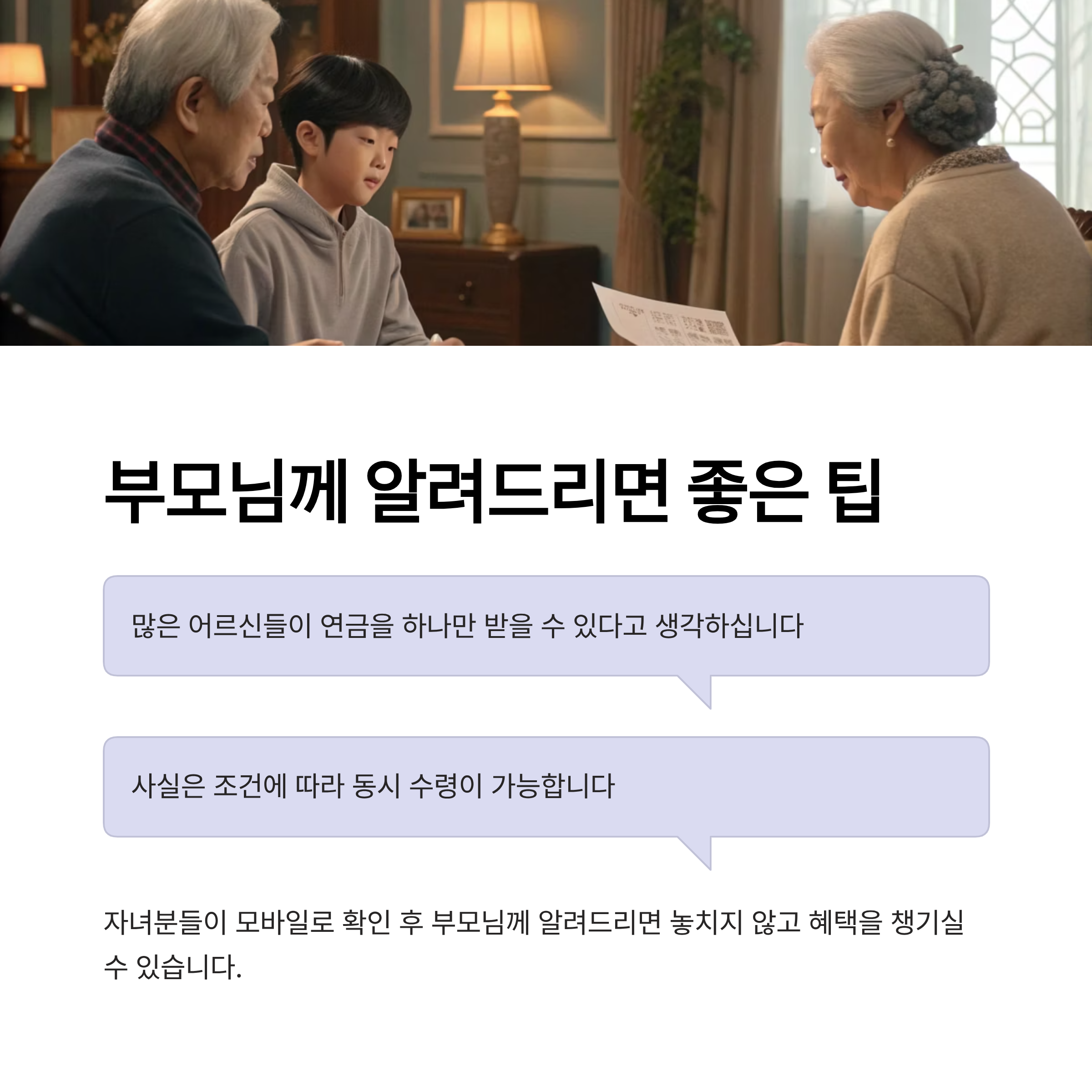 많은 어르신들이 연금을 하나만 받을 수 있다고 생각하시지만, 사실은 조건에 따라 동시 수령이 가능합니다. 자녀분들이 모바일로 확인 후 부모님께 알려드리면 놓치지 않고 혜택을 챙기실 수 있습니다.