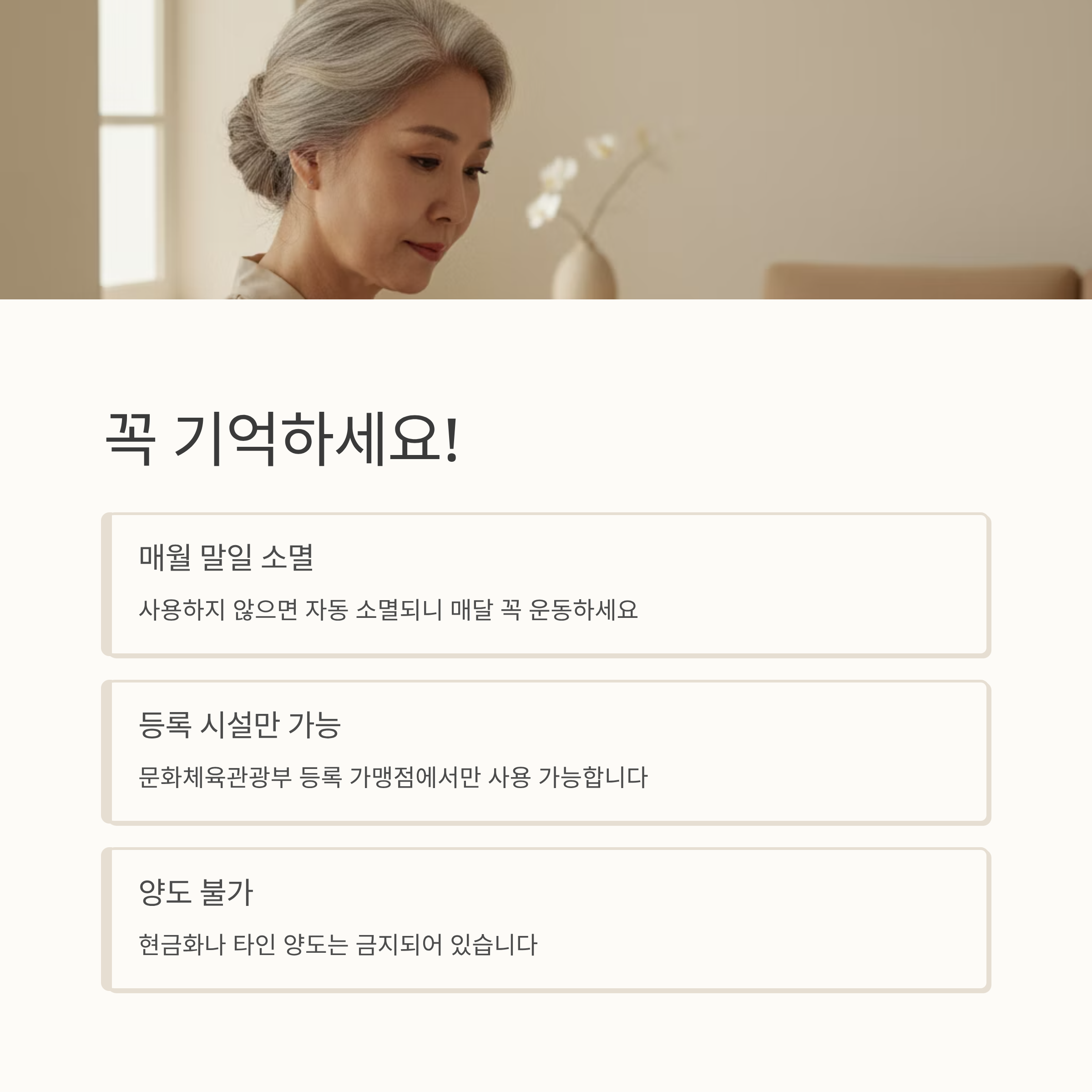 또한, 등록된 시설에서만 사용 가능하며 현금화나 타인 양도는 금지됩니다.
