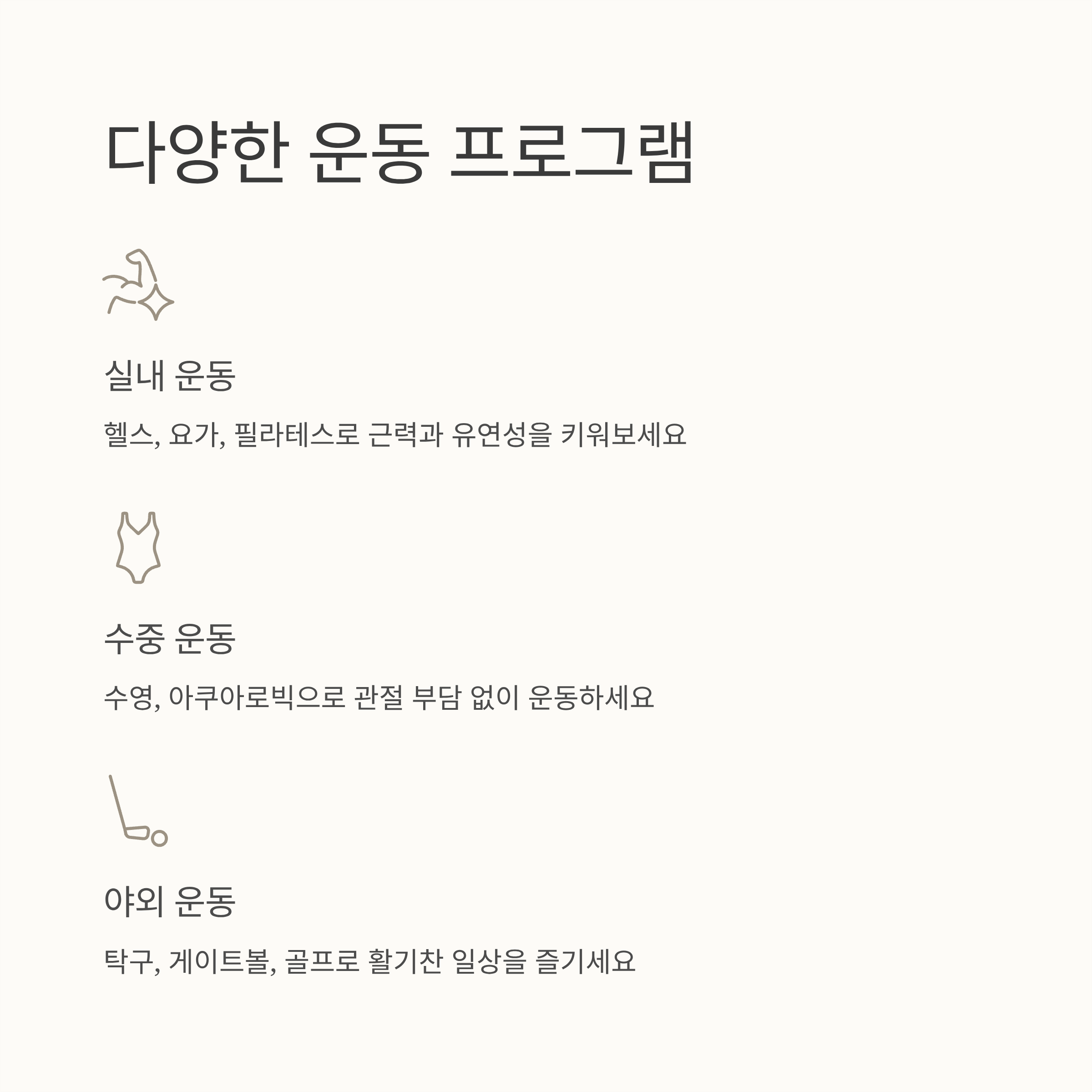 | 실내 운동 | 헬스, 요가, 필라테스 등 |