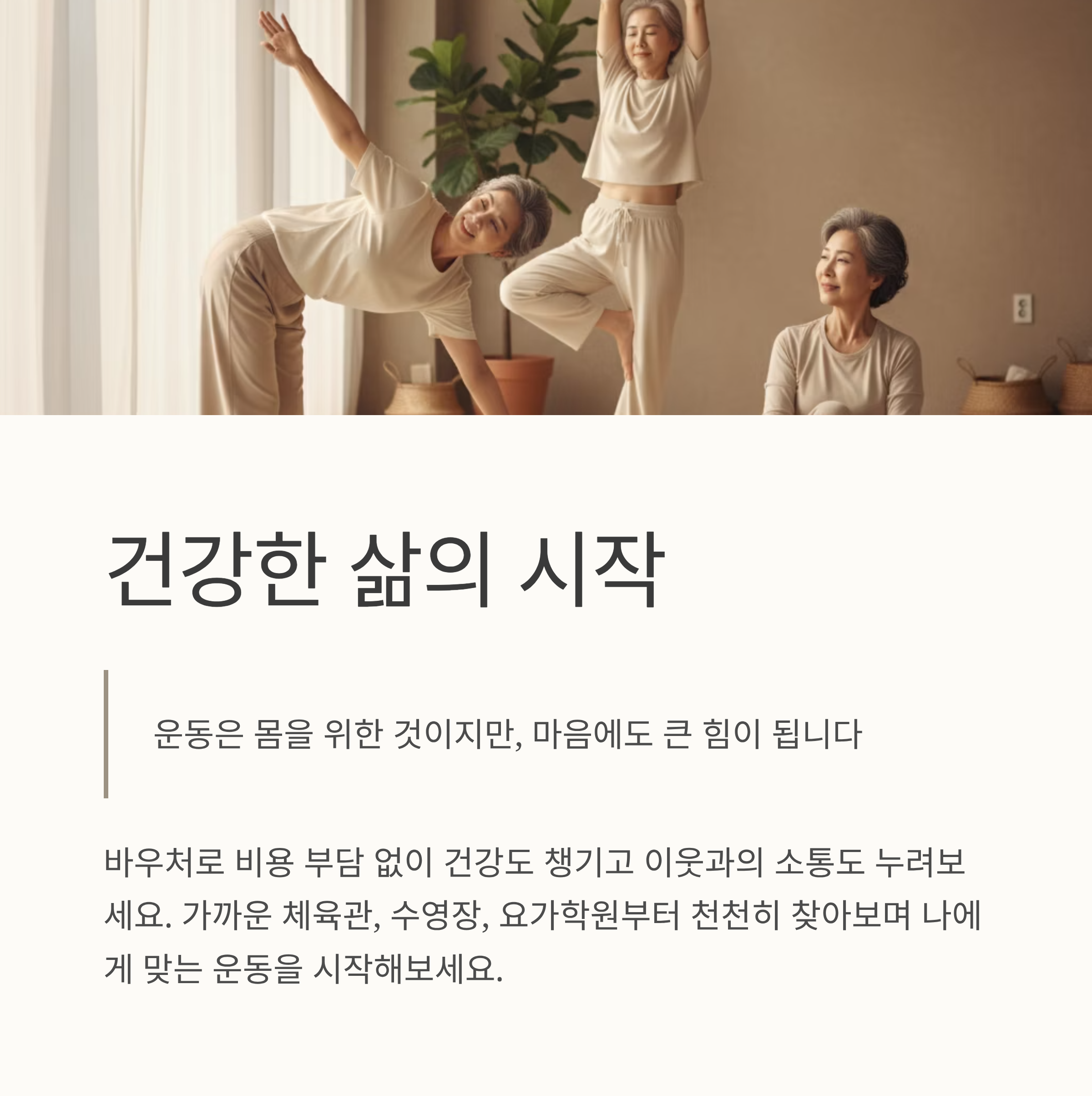 바우처를 통해 비용 부담 없이 건강도 챙기고, 이웃과의 소통도 누려보세요.