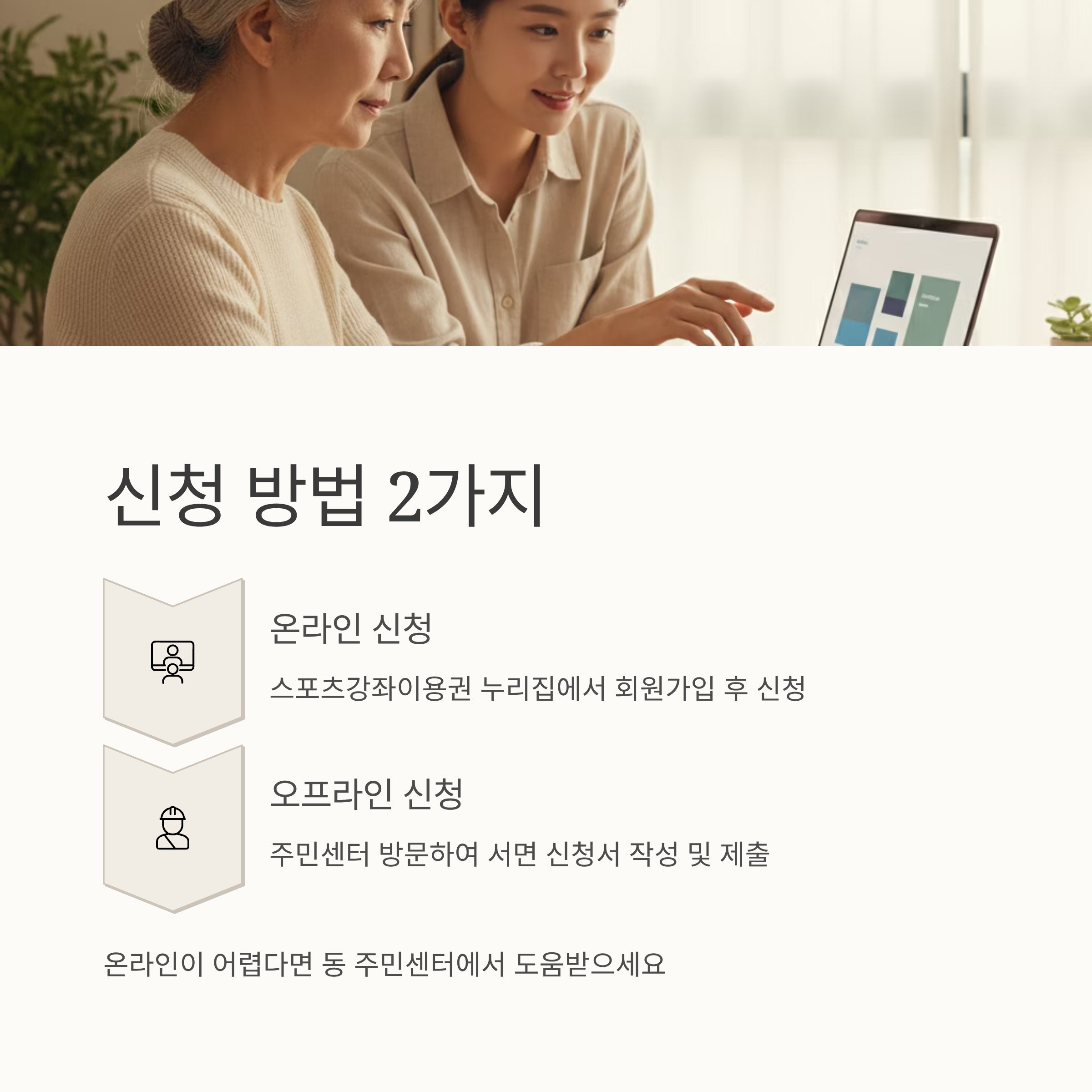 스포츠강좌이용권 누리집(www.svoucher.kspo.or.kr)에서 회원가입 후 신청 - 오프라인 신청