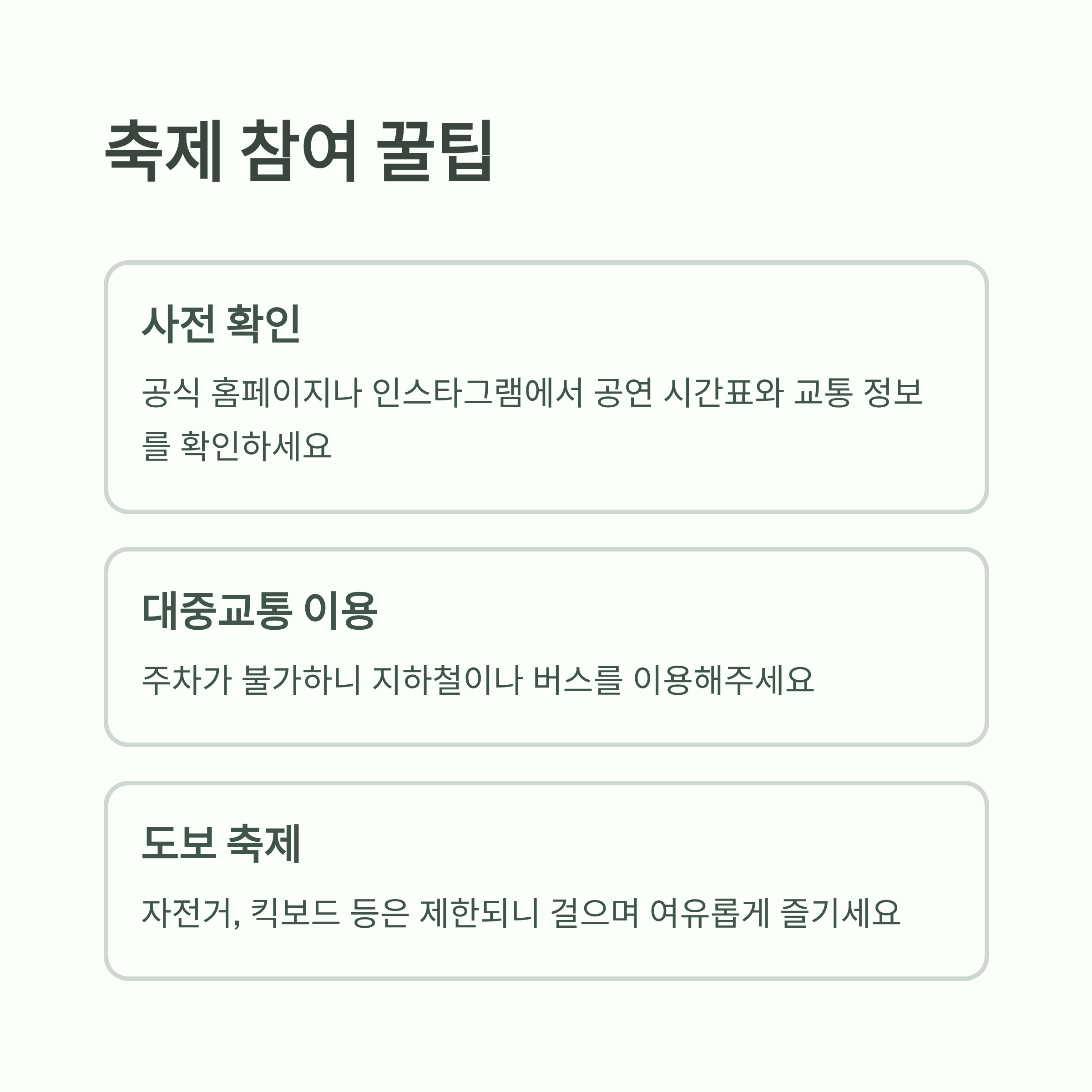 주차 불가, 대중교통 이용 안내, 공연 시간표 등을 꼭 확인하세요.