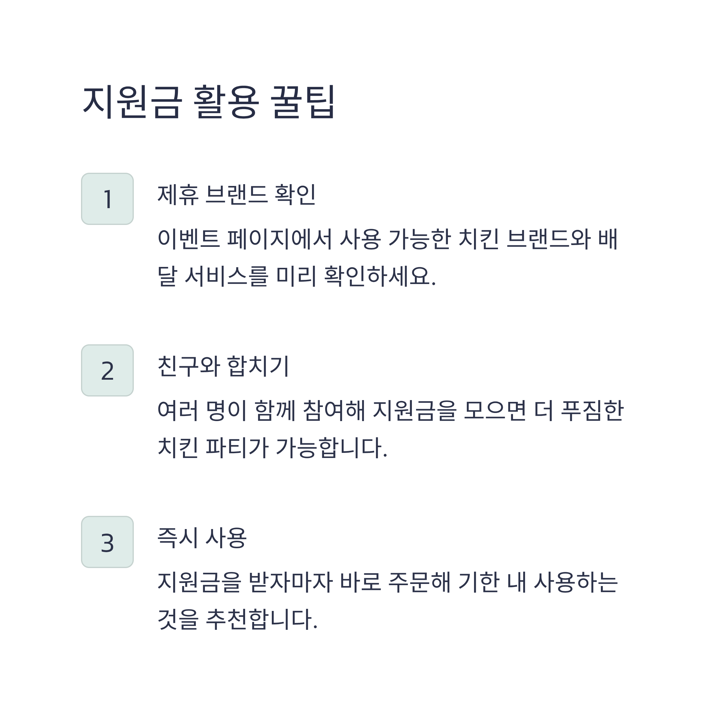 치킨 지원금 외에도 다양한 프로모션이 함께 진행되니, 앱 내 공지나 이벤트 페이지를 확인하는 것이 좋습니다.