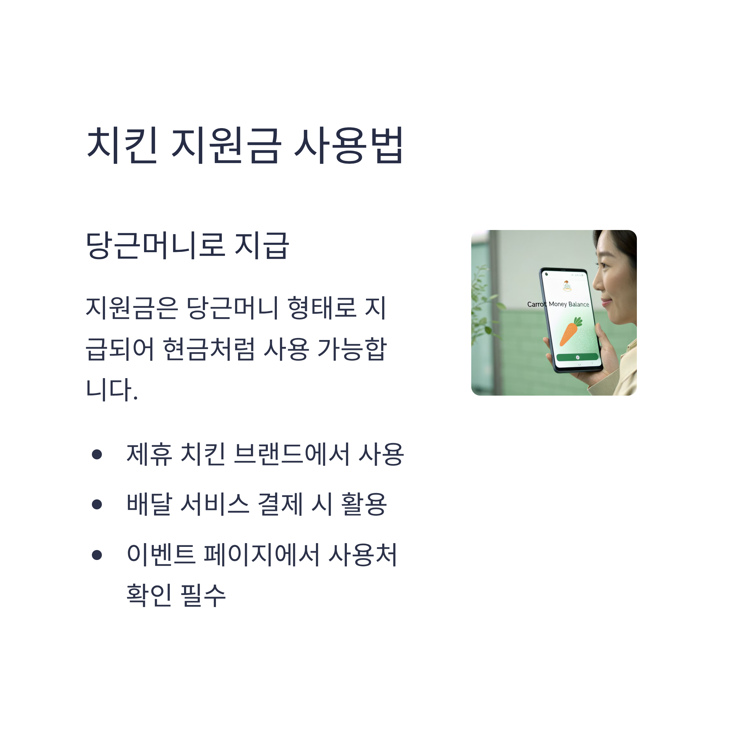지원금은 당근머니 형태로 지급되는 경우가 많으며, 제휴된 치킨 브랜드나 배달 서비스에서 현금처럼 사용할 수 있습니다. 이벤트 페이지에 사용처가 명시되어 있으니 확인 후 활용하는 것이 중요합니다.