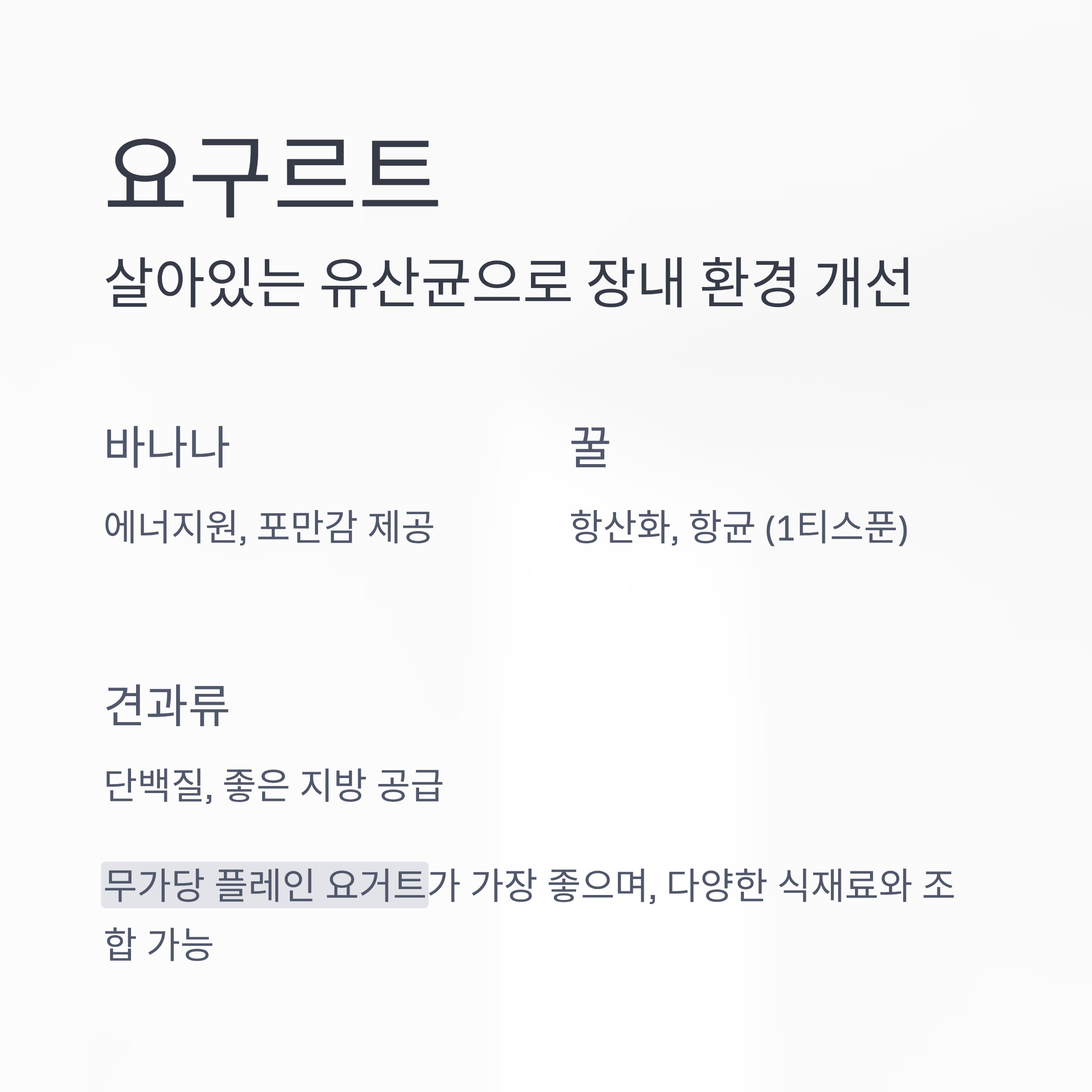 | 바나나 | 에너지원, 포만감 | 슬라이스해서 함께 섭취 |