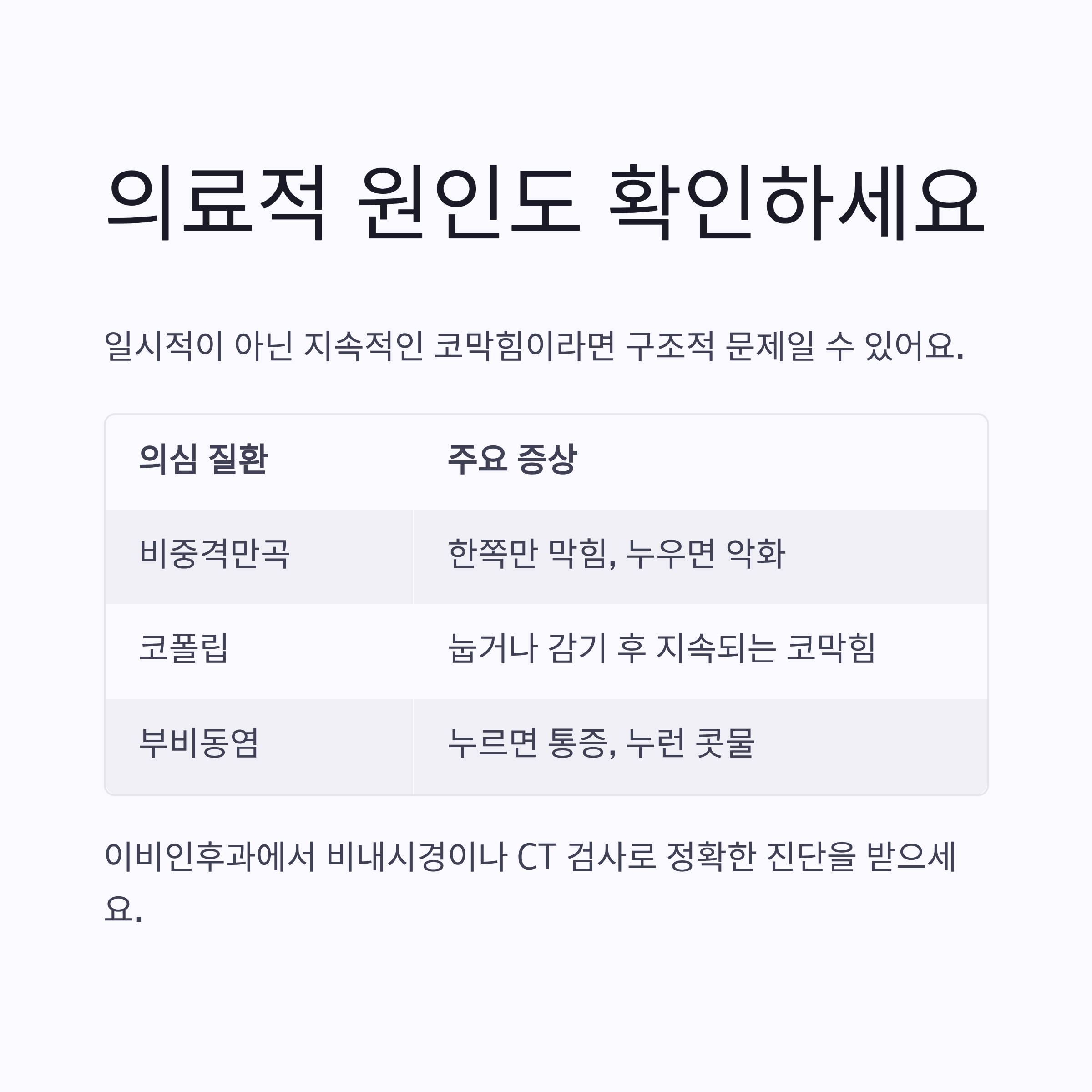 비염 외에도 코폴립(물혹), 비중격만곡, 부비동염(축농증) 등 의학적인 구조적 문제로 인해 밤에 코가 막힐 수 있어요.