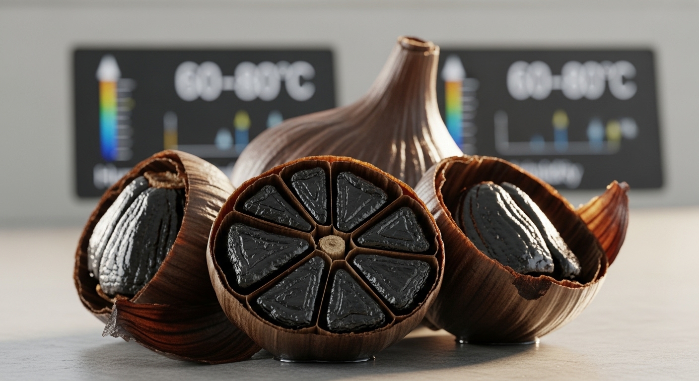 흑마늘은 단순히 오래된 마늘이 아닙니다. 생마늘을 60~80℃의 고온과 높은 습도에서 수주 간 발효·숙성하면,