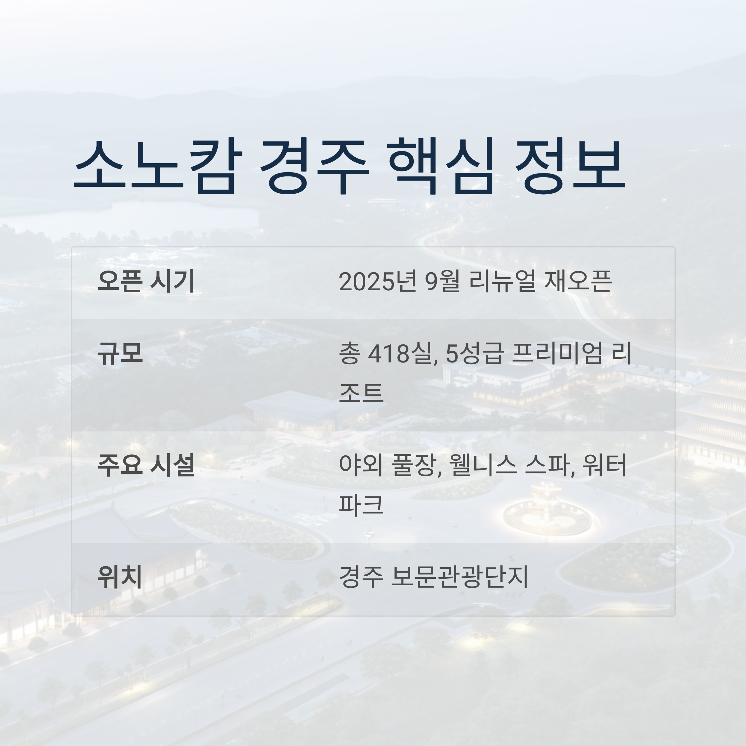 2025년 9월, 소노캄 경주가 대규모 리뉴얼을 마치고 5성급 프리미엄 리조트로 새롭게 문을 열었습니다. 약 1,700억 원이 투입된 이번 리뉴얼을 통해 객실과 부대시설이 한층 현대적이고 세련되게 변화했으며, 보문호수와 조화를 이루는 전망과 다양한 편의시설로 여행객들에게 특별한 휴식 공간을 제공합니다.