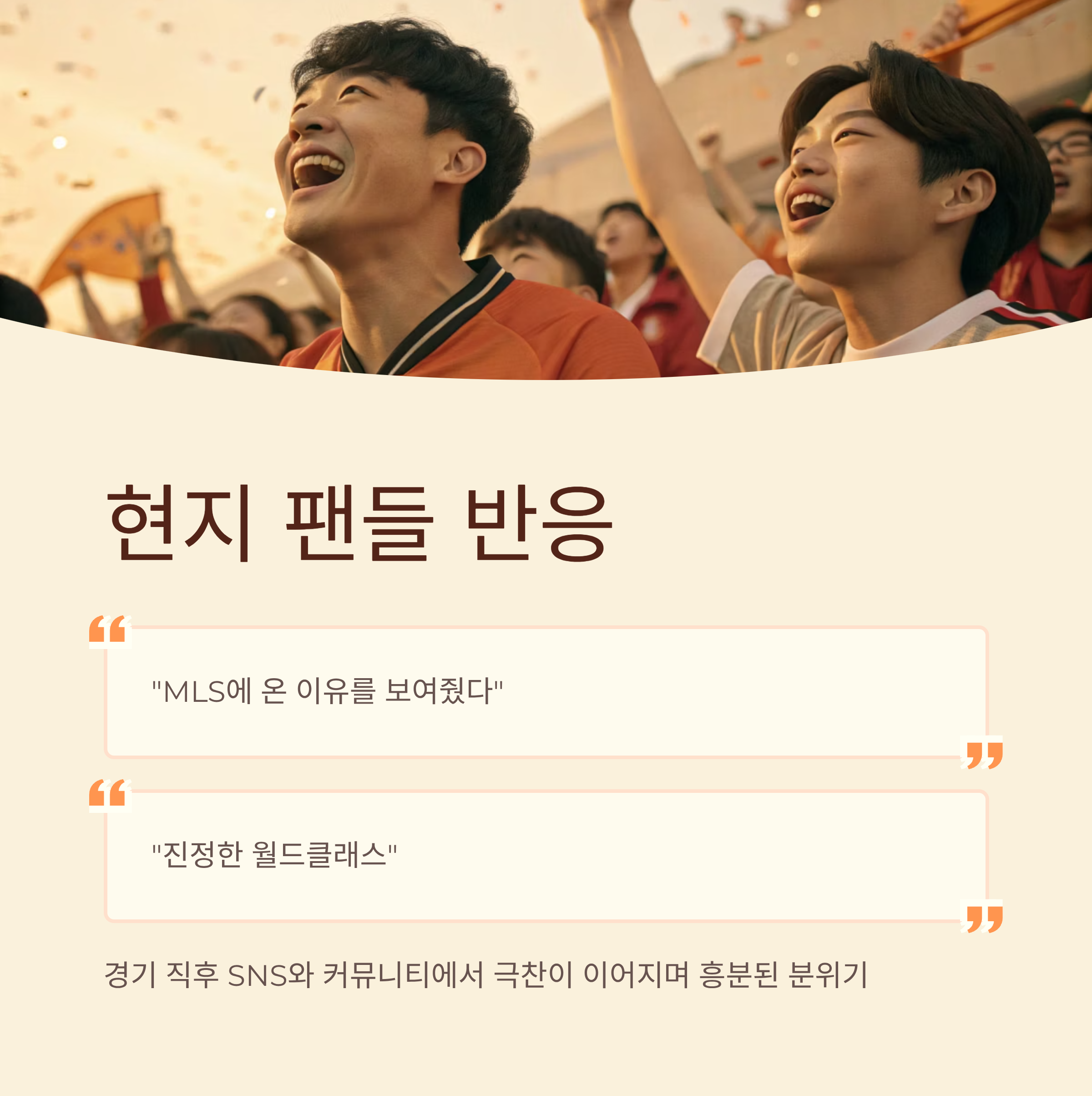 경기 직후 현지 팬들은 SNS와 커뮤니티에서 손흥민을 극찬했습니다. 특히 "MLS에 온 이유를 보여줬다", "진정한 월드클래스"라는 반응이 이어지며 흥분된 분위기를 드러냈습니다.