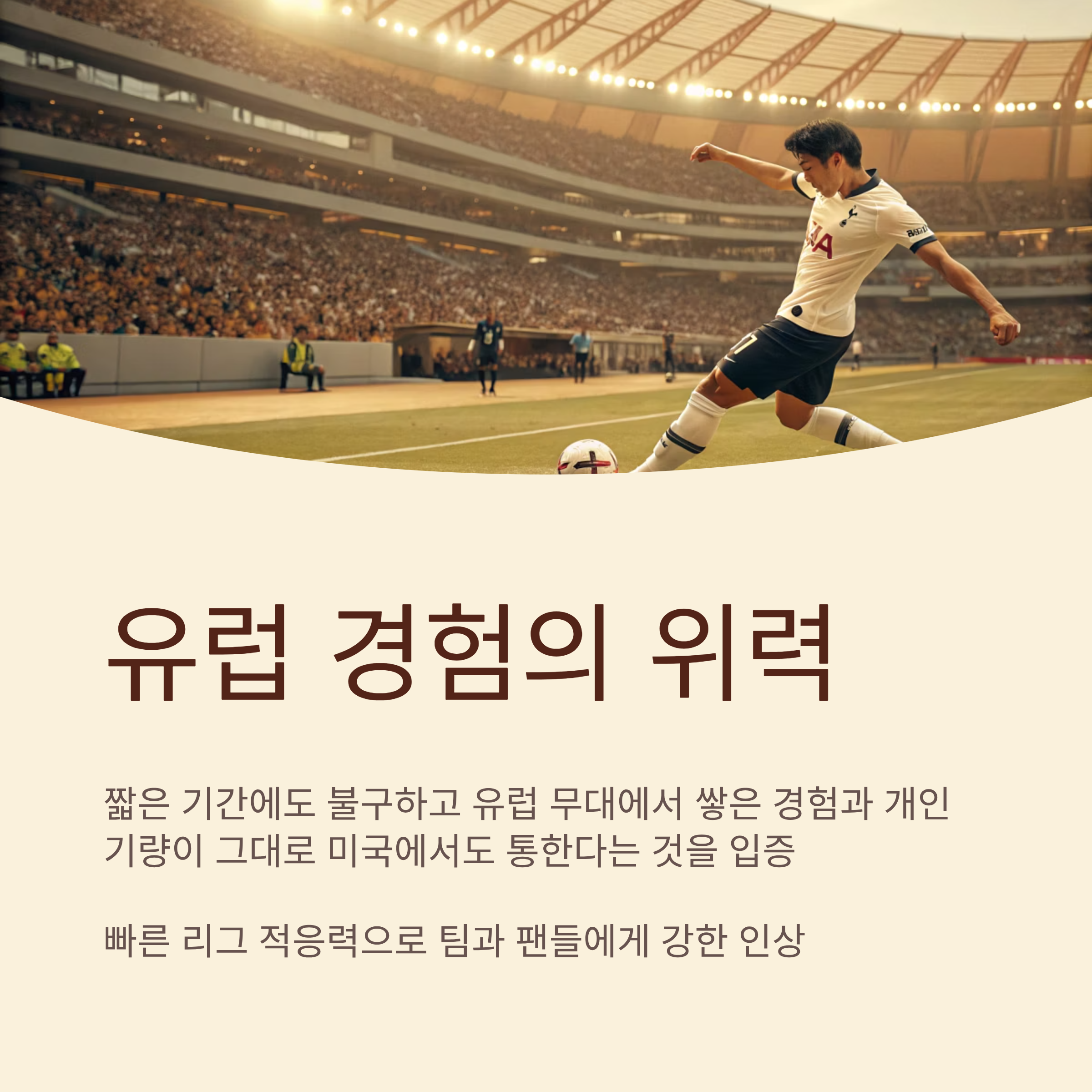 짧은 기간에도 불구하고 손흥민은 5경기 6골이라는 놀라운 기록을 만들며 빠르게 리그에 적응하고 있습니다. 유럽 무대에서 쌓은 경험과 개인 기량이 그대로 미국에서도 통한다는 것을 입증한 셈입니다.