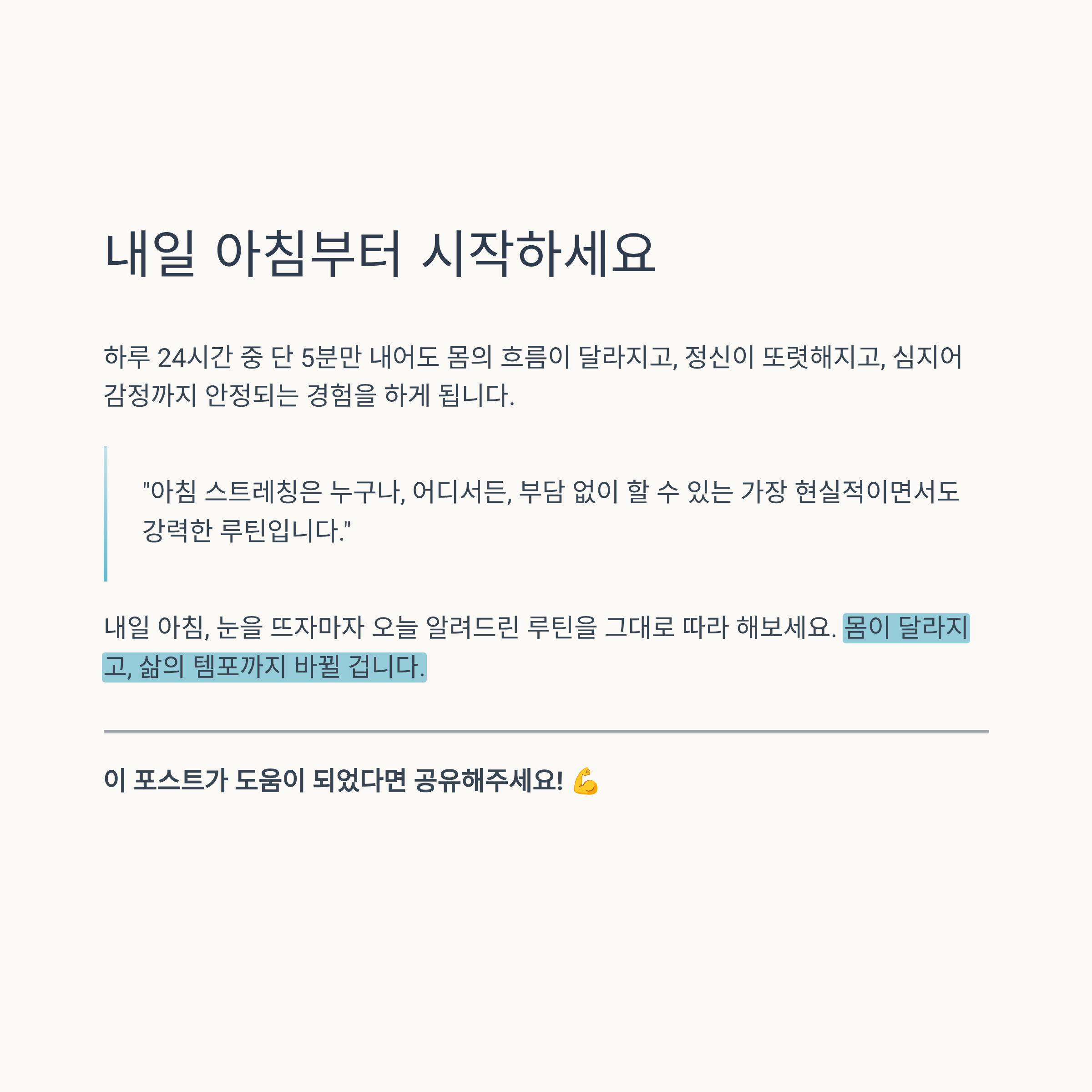 처음에는 단순히 "몸 좀 덜 피곤해졌네?"로 느낄 수 있어요. 하지만 일주일만 꾸준히 반복해 보면, 아침 스트레칭은 생각보다 다양한 변화를 만들어냅니다.