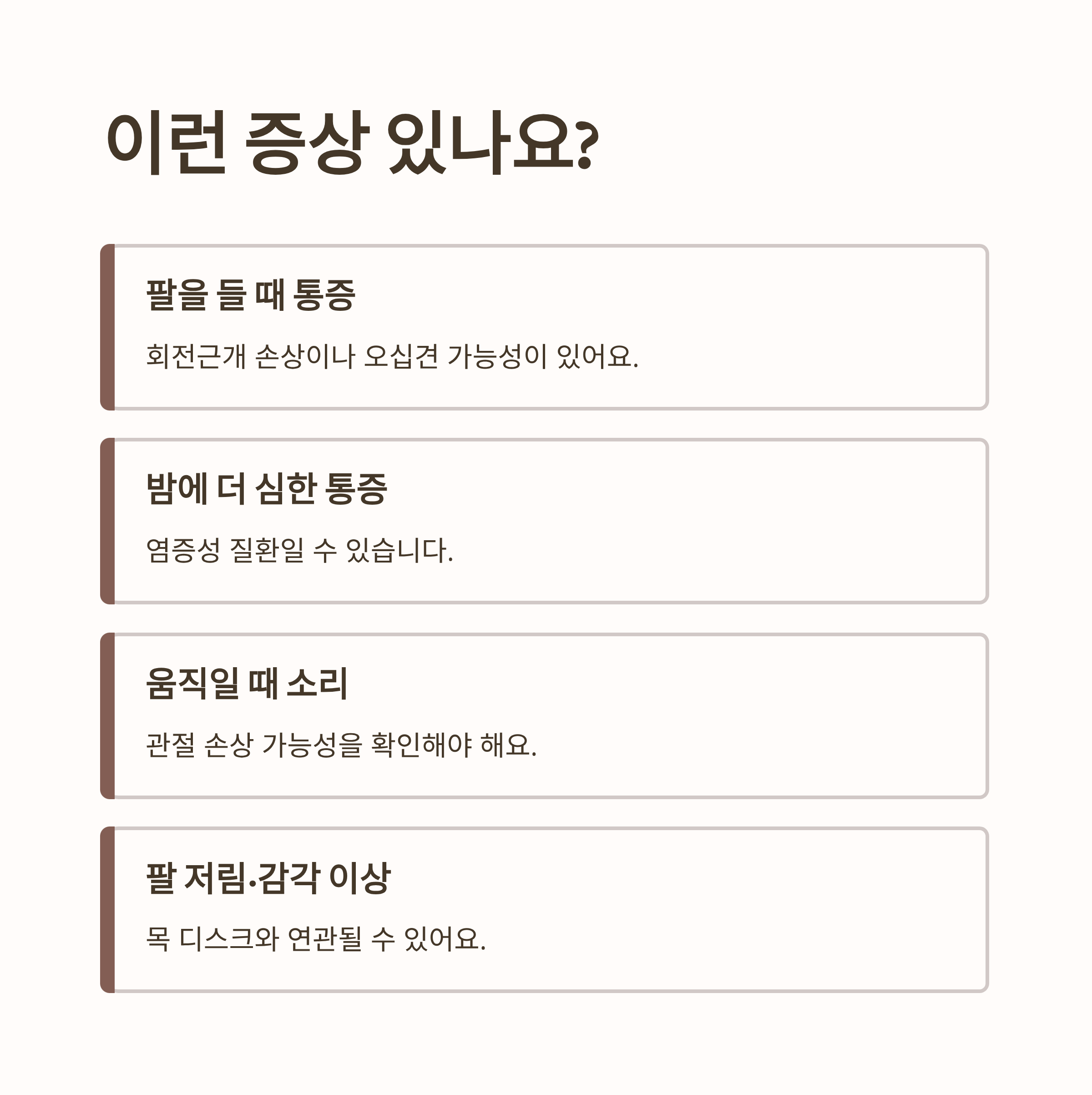 | 팔을 들 때 통증 | 회전근개 손상, 오십견 가능성 |
