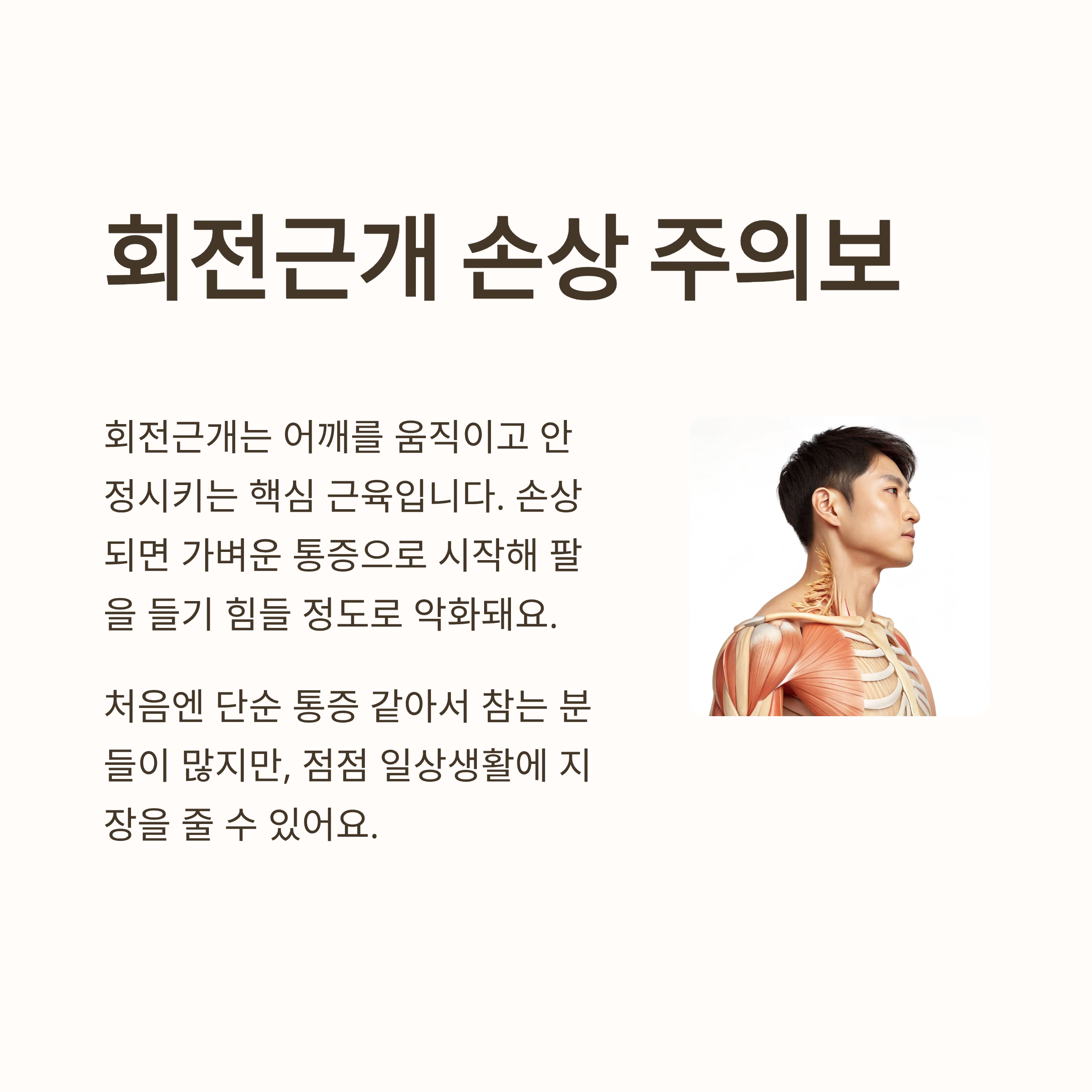 회전근개는 어깨를 움직이고 안정시키는 데 중요한 근육인데, 이 부위가 손상되면 가벼운 통증으로 시작해 팔을 들기 힘들 정도로 진행될 수 있습니다.