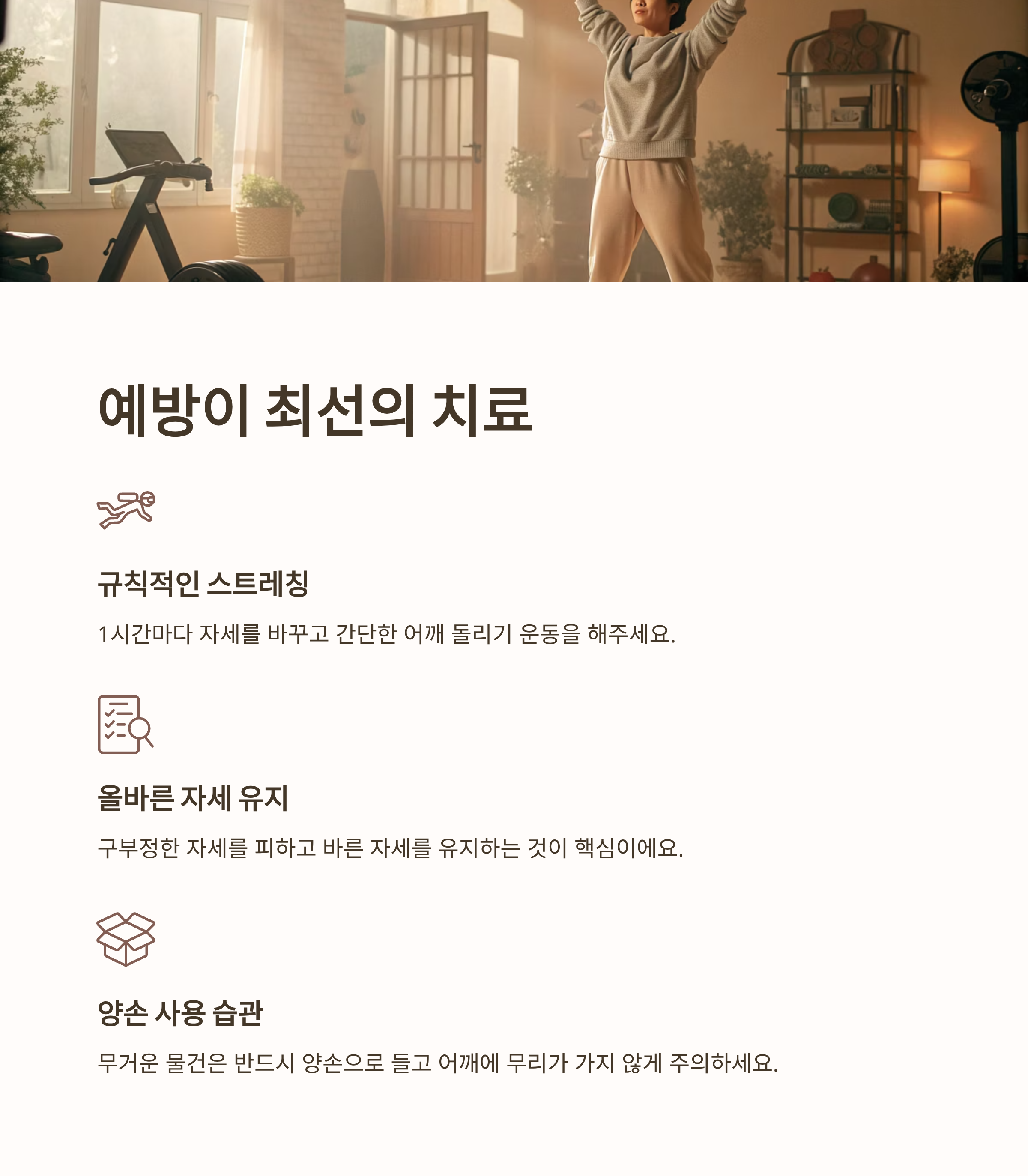 정기적인 운동과 더불어, 무거운 물건을 들 땐 반드시 양손을 사용하고, 어깨에 무리가 가지 않도록 주의하는 것이 중요합니다.