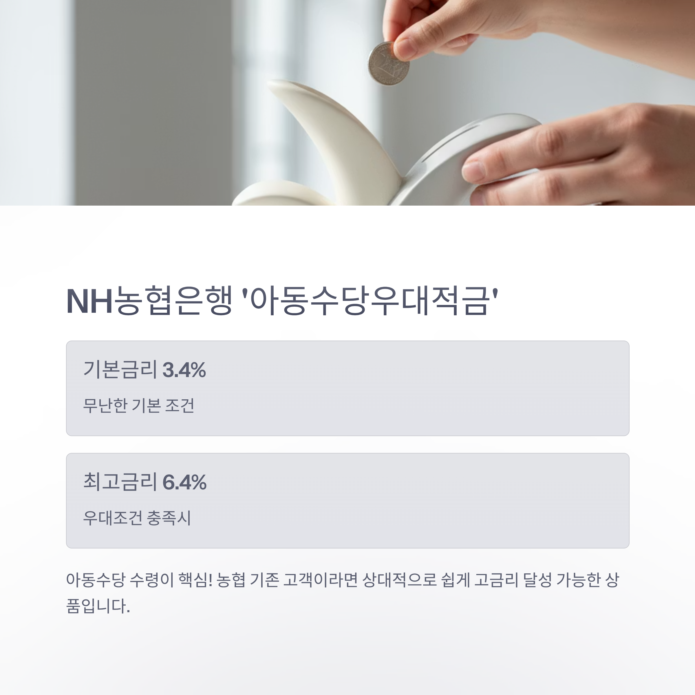 | NH농협은행 | 아동수당우대적금 | 3.4% | 6.4% | 아동수당 수령, 자동이체, 카드 실적 |