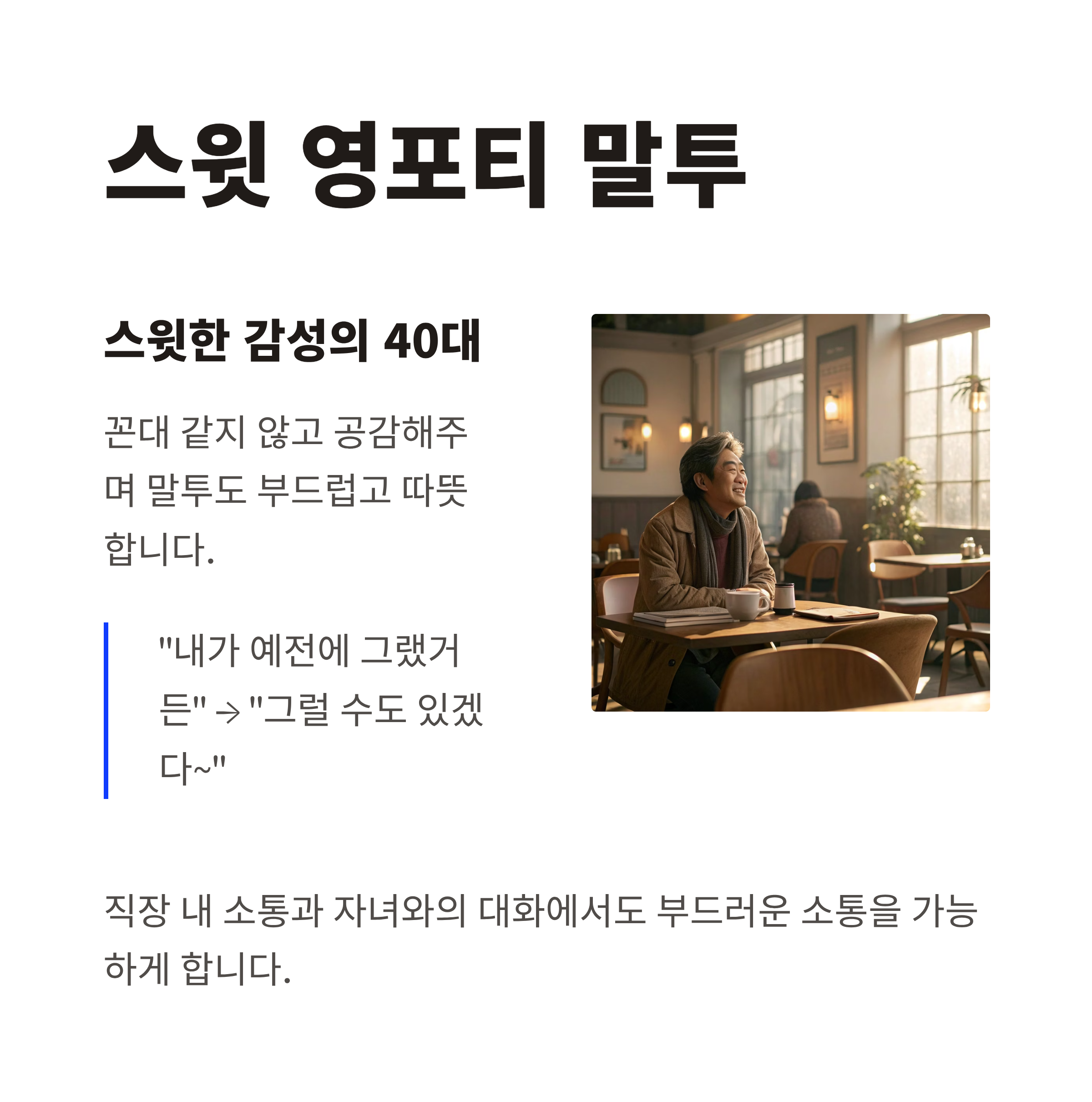 꼰대 같지 않고, 공감해주며 말투도 부드럽고 따뜻하죠.