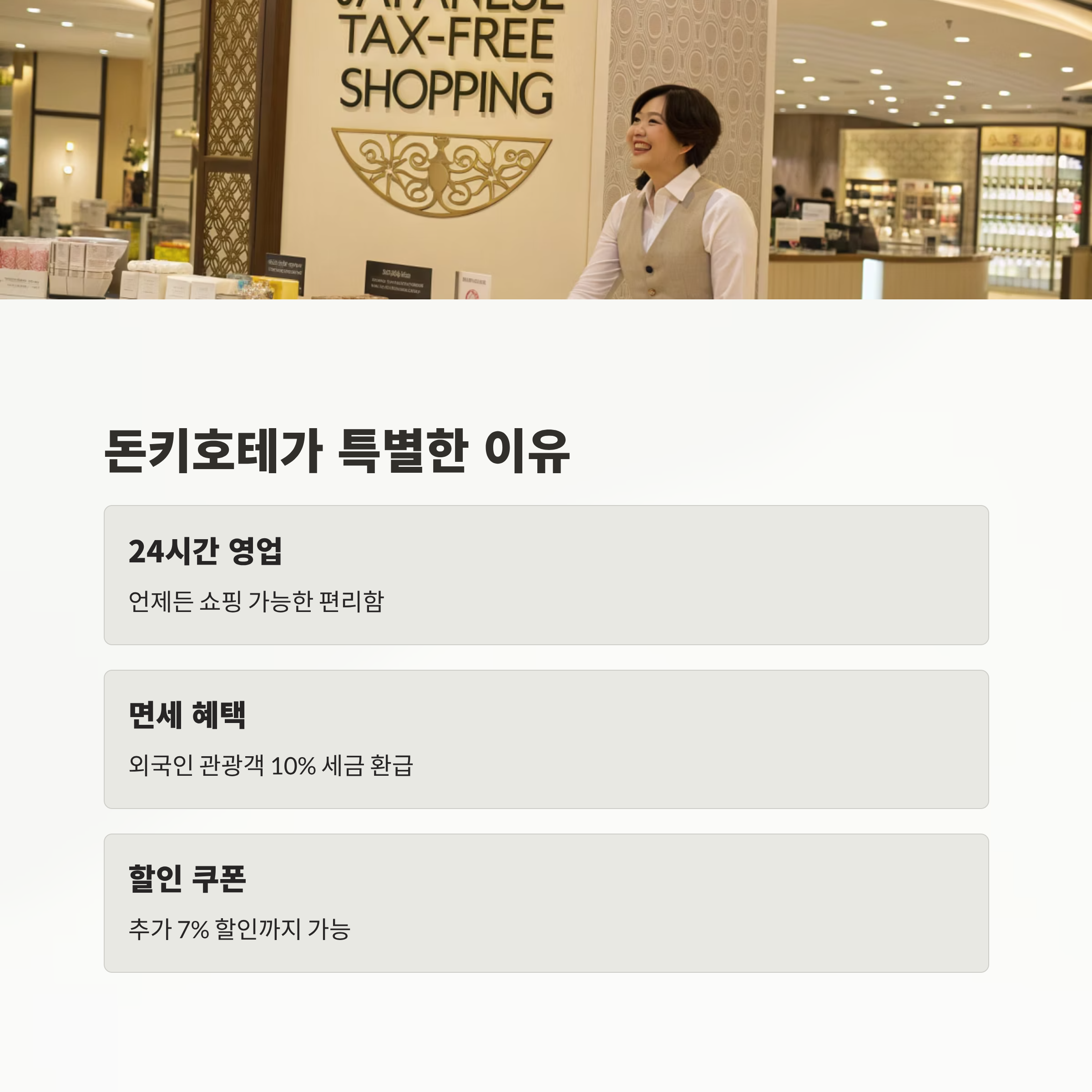 일본 여행을 간다면 절대 빠질 수 없는 곳, 바로 돈키호테입니다. '돈키'라는 애칭으로 불릴 정도로 현지인과 관광객 모두에게 인기 있는 이곳은 24시간 영업, 면세, 할인쿠폰까지 한 번에 해결할 수 있는 쇼핑 천국이에요. 오늘은 일본 전역의 돈키호테에서 꼭 사야 할 추천템 15가지와 함께, 면세받는 방법, 할인쿠폰 받는 꿀팁까지 총정리해드릴게요!