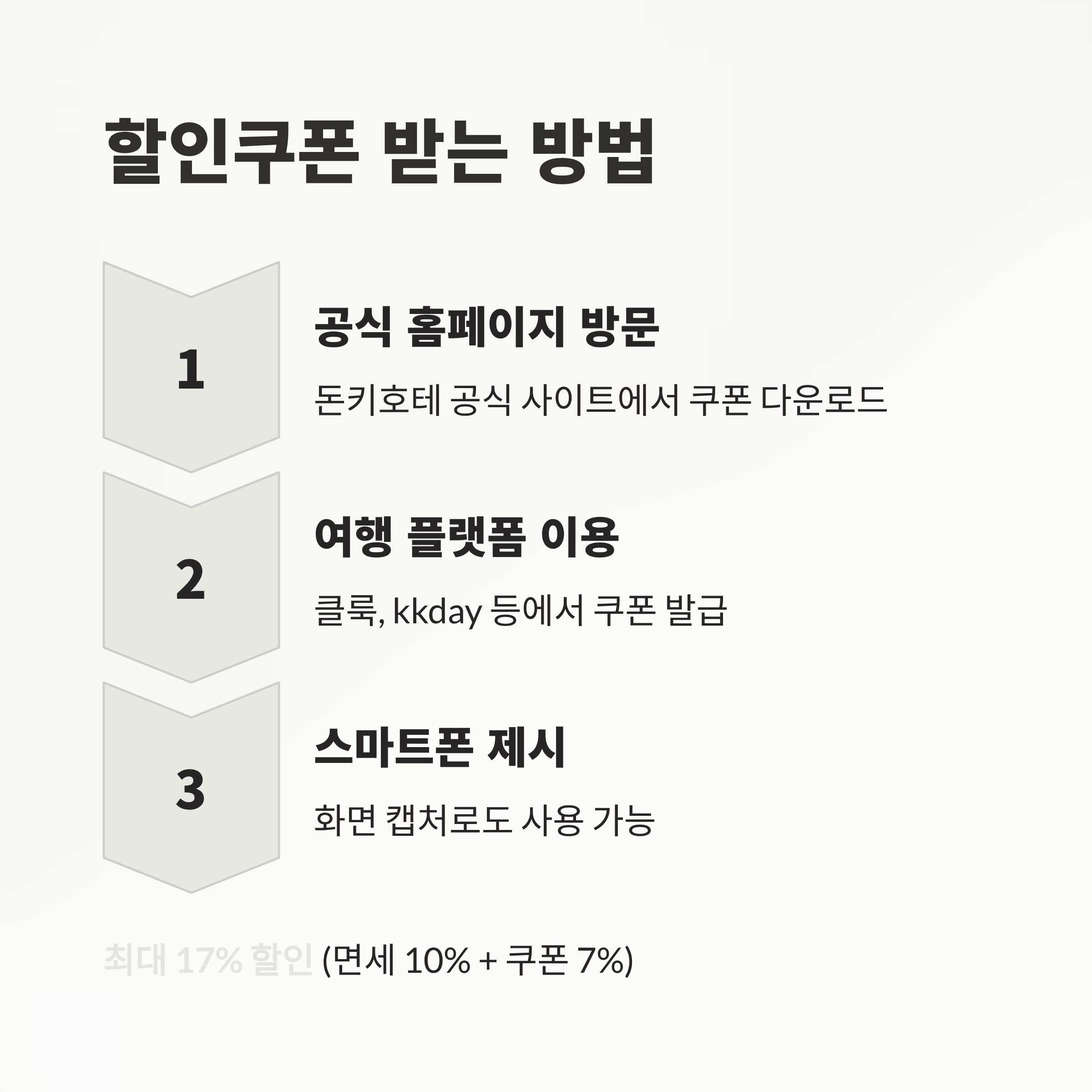 돈키호테 공식 홈페이지 또는 트래블포트, 클룩(KLOOK), kkday 등의 여행 플랫폼에서 쿠폰 다운 가능 - 스마트폰 제시 가능