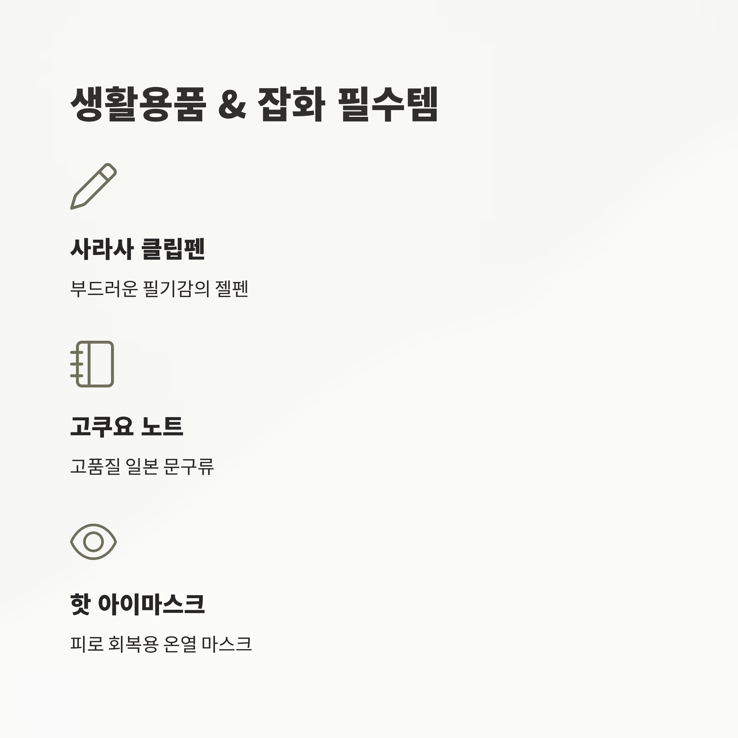 | 생활용품 | 사라사 클립펜, 고쿠요 노트, 핫 아이마스크 |