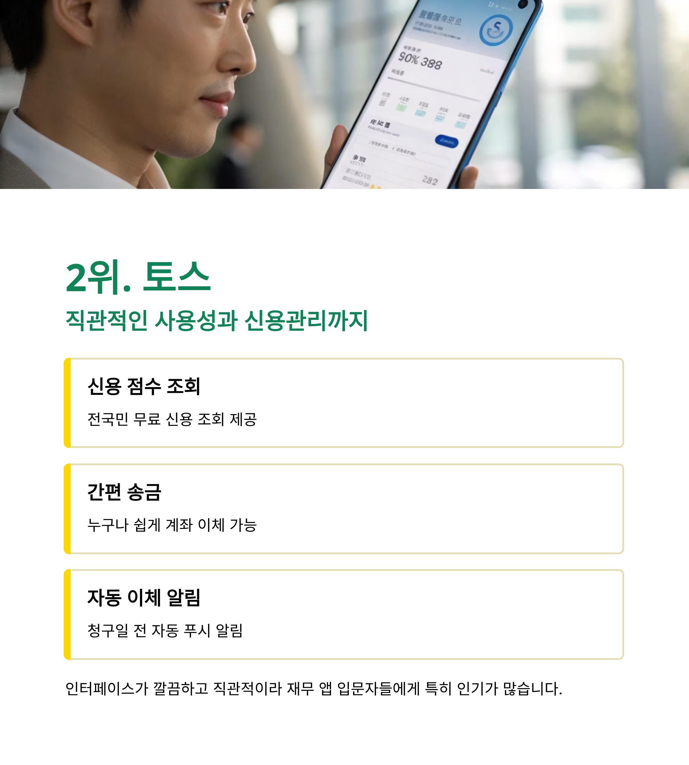 | 가볍고 빠른 UI | 토스 | 초보자도 금방 적응 가능 |