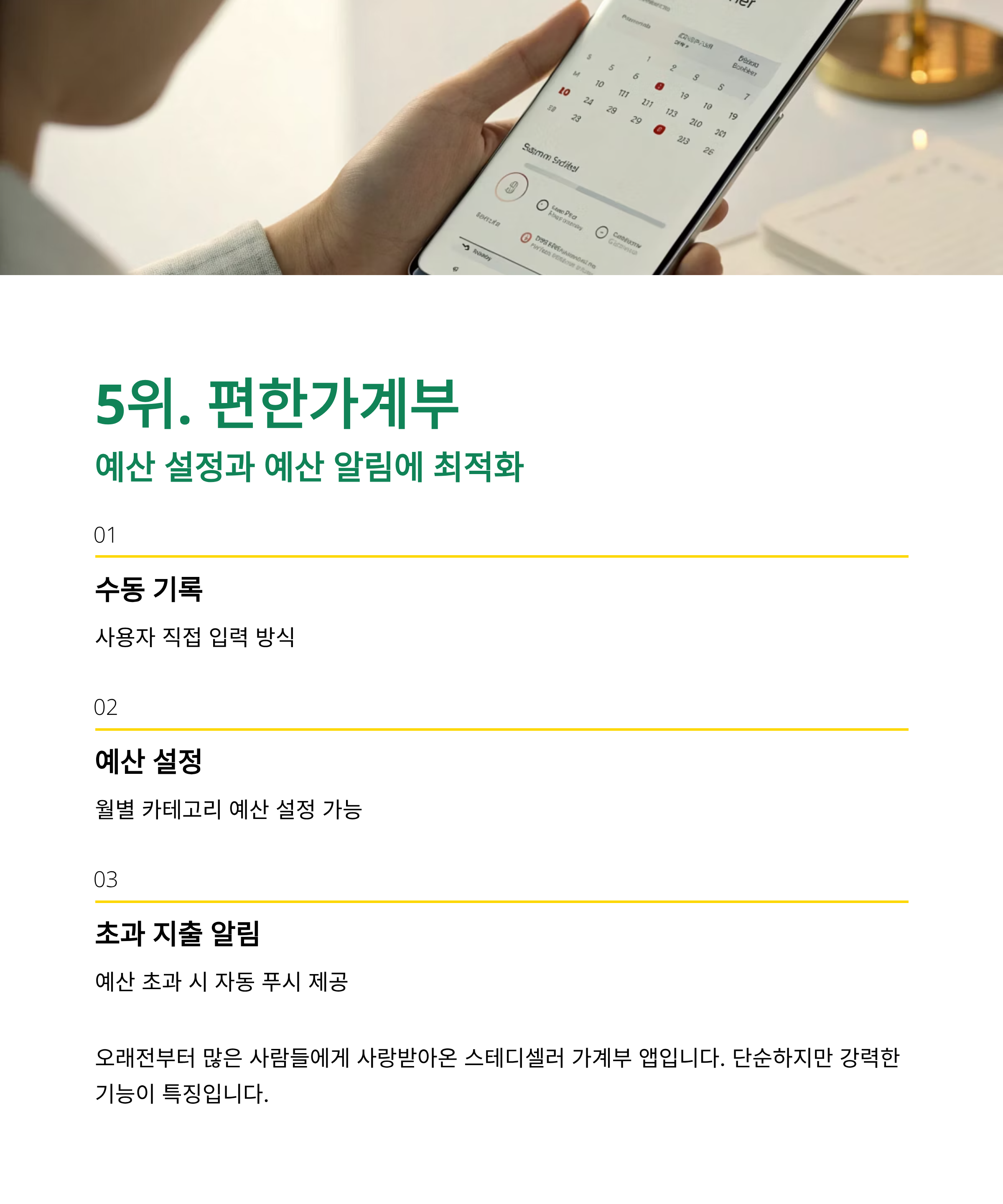 | 전통적 예산 관리 | 편한가계부 | 클래식 방식이 익숙한 사용자에게 적합 |