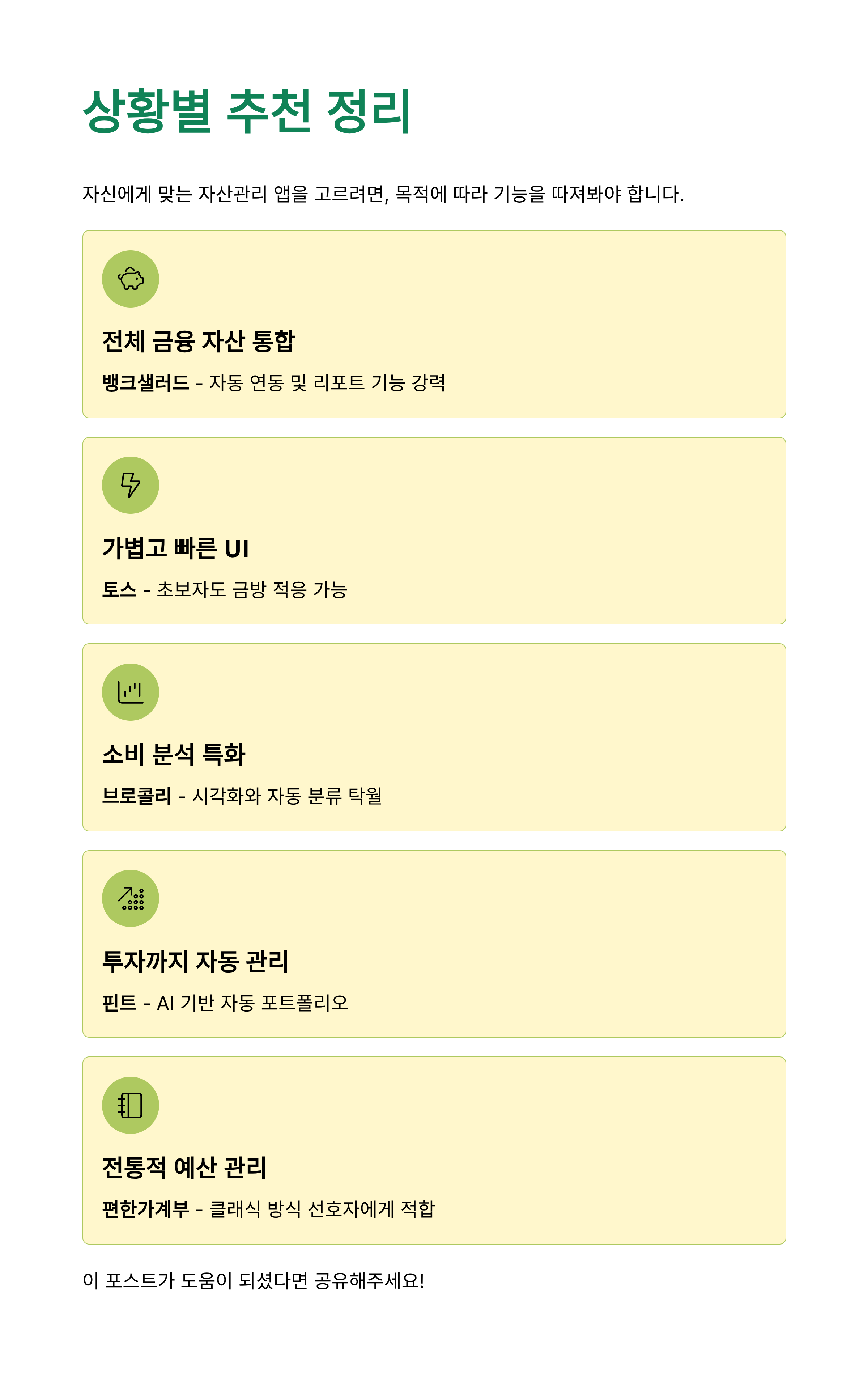 자신에게 맞는 자산관리 앱을 고르려면, 단순히 평점만 볼 게 아니라 목적에 따라 기능을 따져봐야 합니다. 아래 정리를 참고해 보세요.