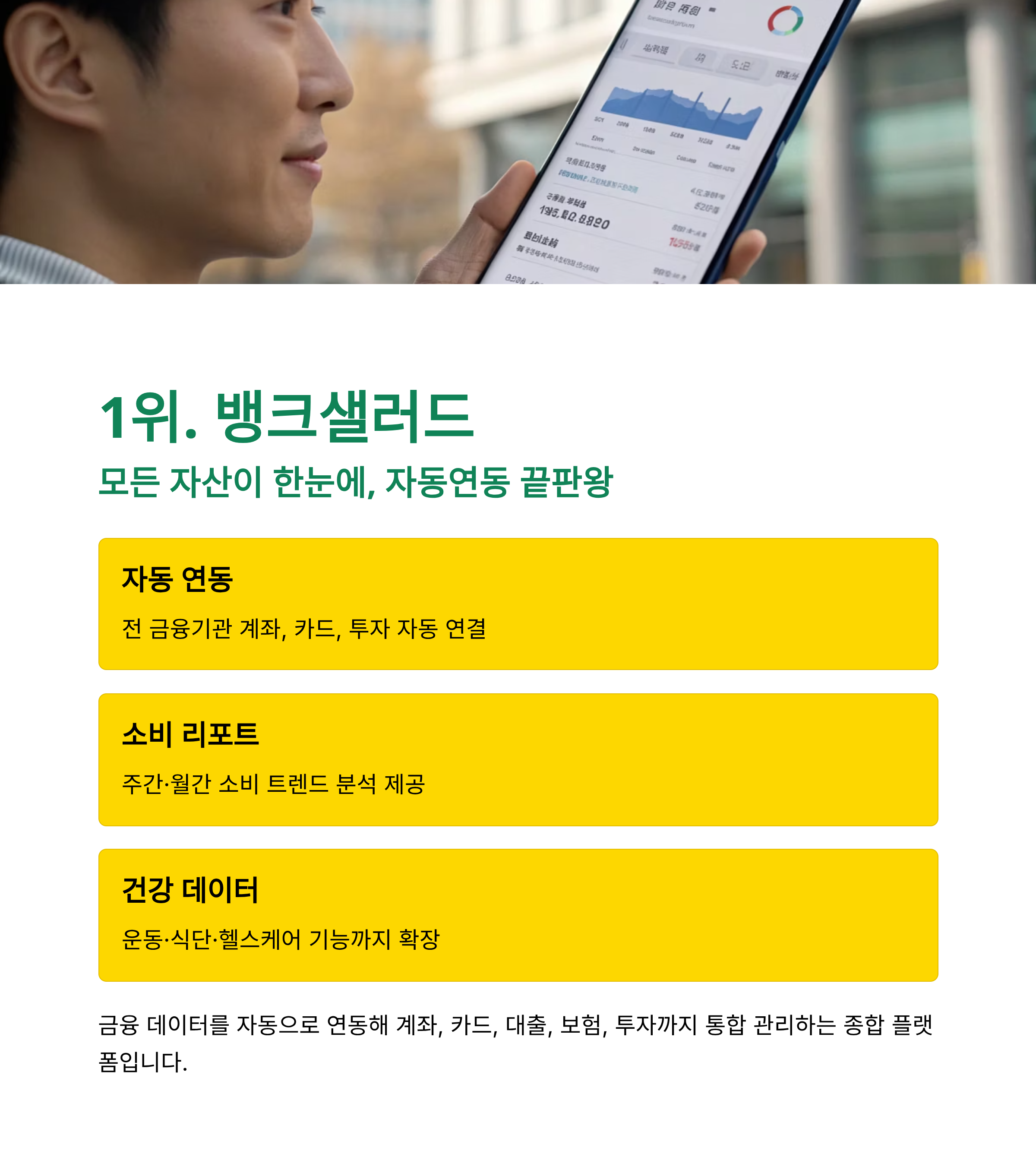 | 전체 금융 자산 통합 관리 | 뱅크샐러드 | 자동 연동 및 리포트 기능 강력 |