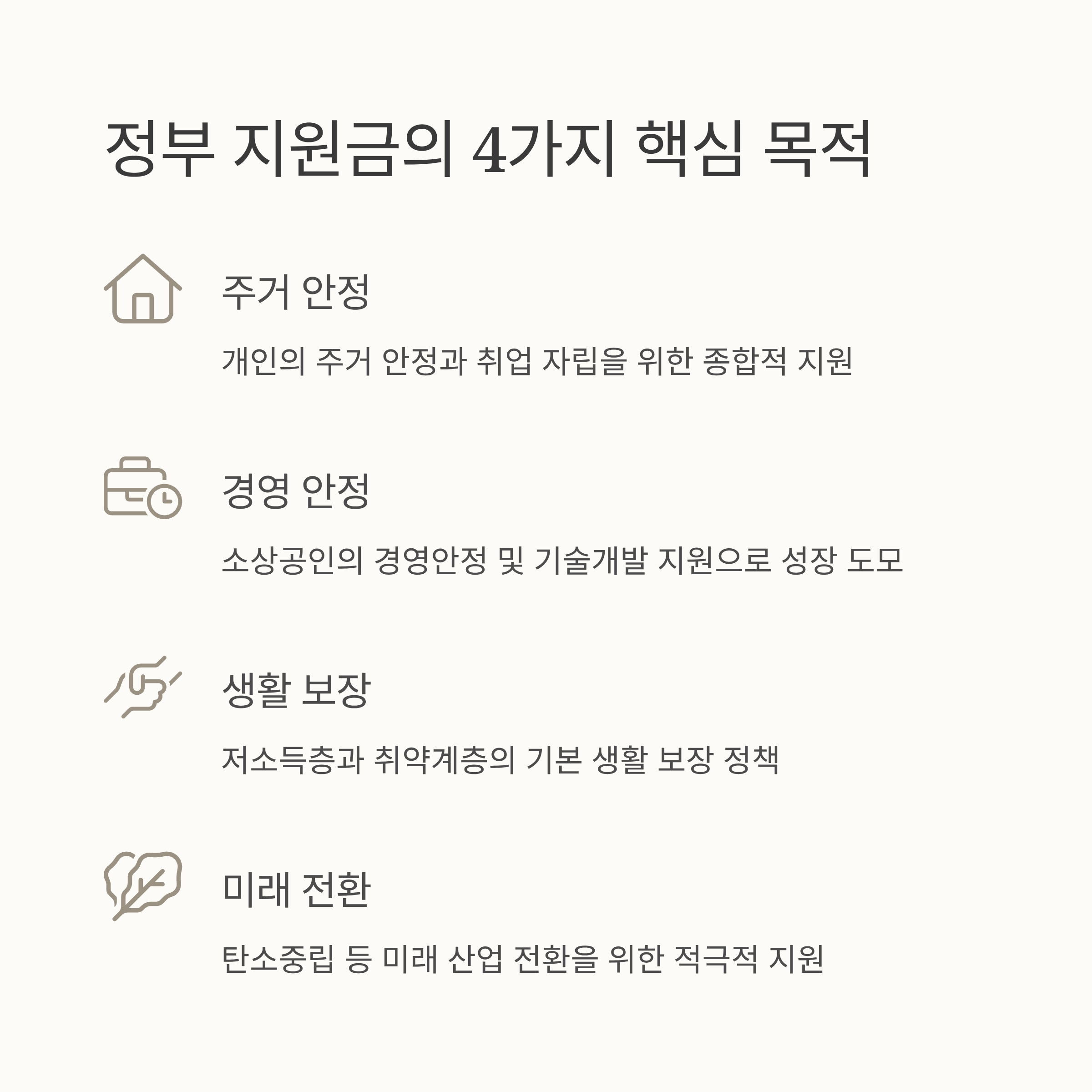 | 저소득/취약계층 | 생계급여, 긴급복지지원, 장애인연금 | 생활 기본권 보장 |