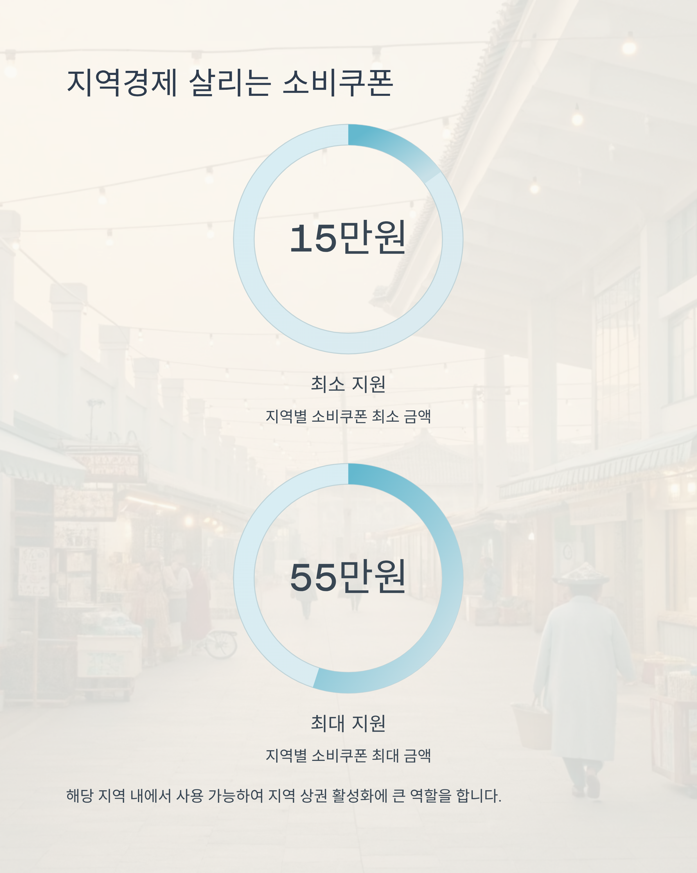 지역별로 지급되는 소비쿠폰은 15만 원에서 최대 55만 원까지 지원됩니다. 해당 지역 내에서 사용할 수 있어 지역 상권 활성화에도 큰 역할을 합니다.