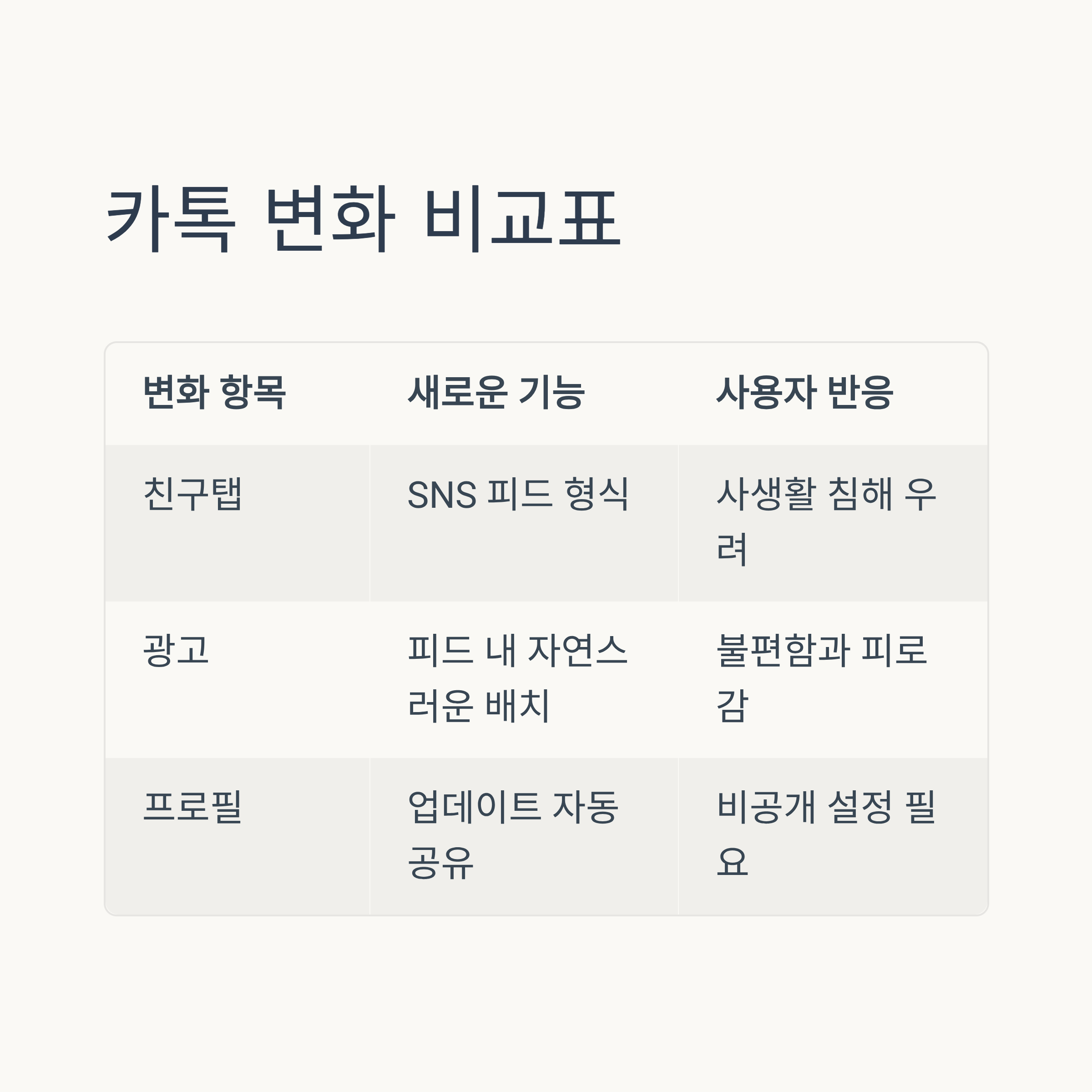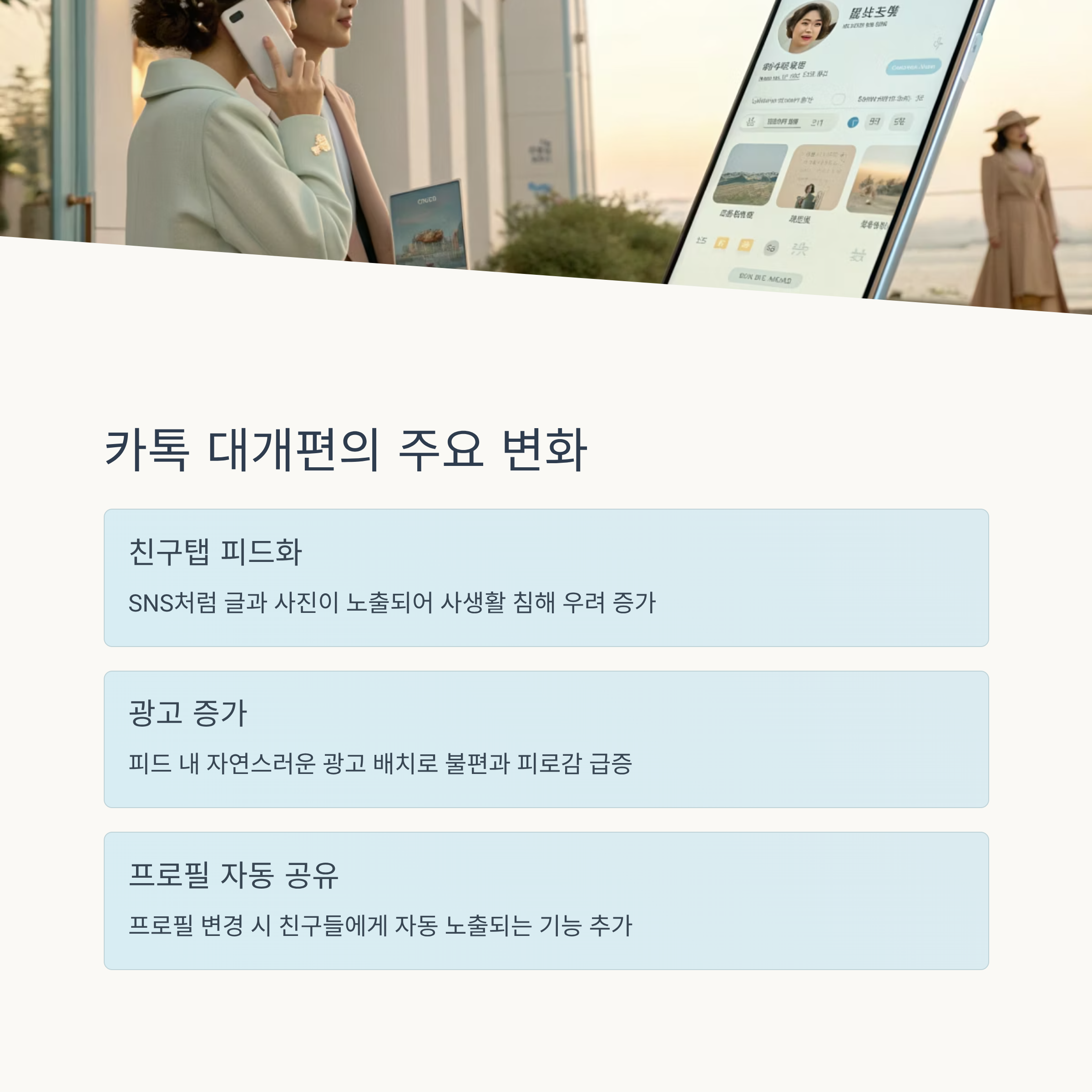 | 친구탭 피드화 | SNS처럼 글·사진 노출 | 사생활 침해 우려 |