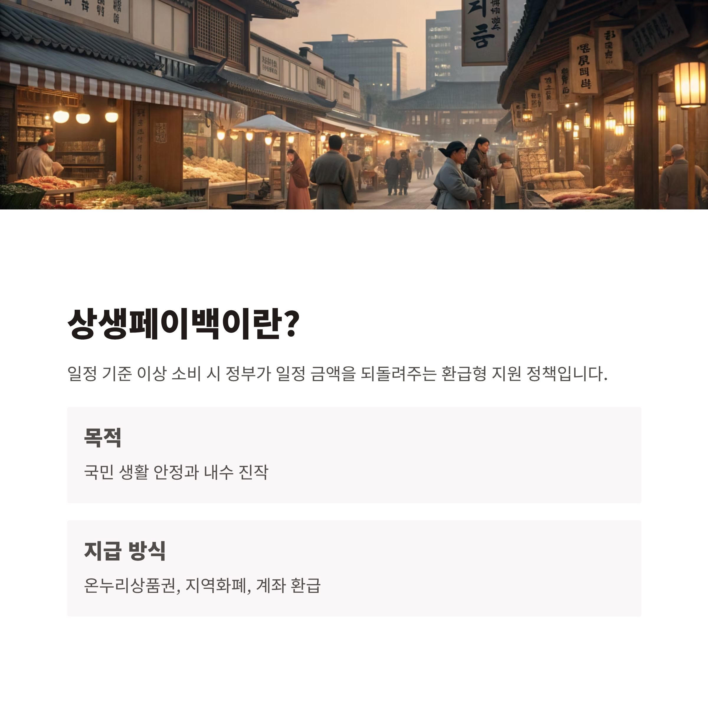 상생페이백은 일정 기준 이상의 소비가 발생했을 때, 정부가 국민에게 일정 금액을 되돌려 주는 환급형 지원 정책입니다. 주로 온누리상품권, 지역화폐, 계좌 환급 방식으로 제공되며, 국민 생활 안정과 내수 진작을 목적으로 합니다.