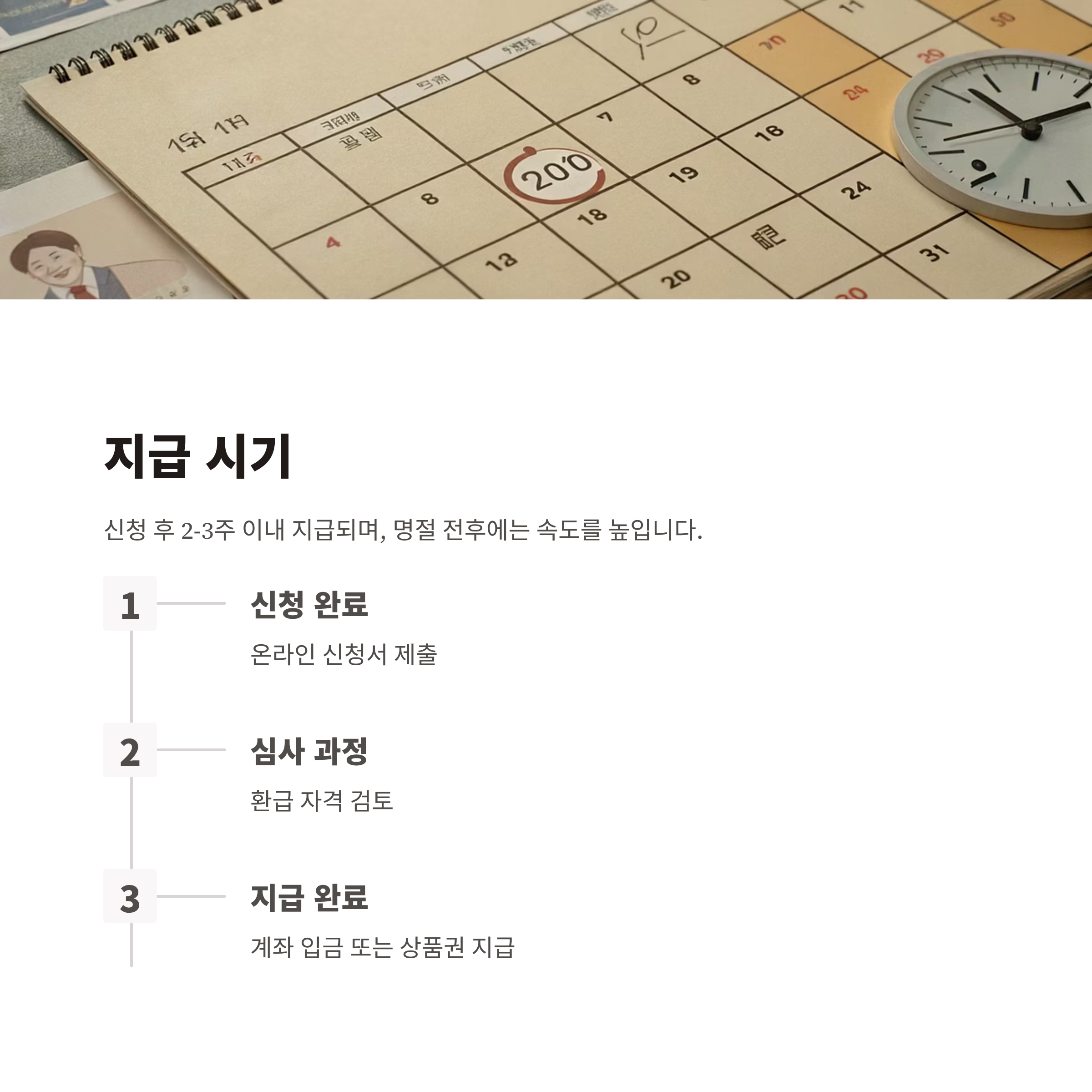 지급은 보통 신청 후 2~3주 이내에 진행되며, 추석이나 설 같은 주요 명절 전후에는 속도를 높여 지급하는 경우가 많습니다. 일부 지역은 단계별로 순차 지급되기 때문에 신청자가 많을수록 지급 시점이 조금 늦어질 수도 있습니다.