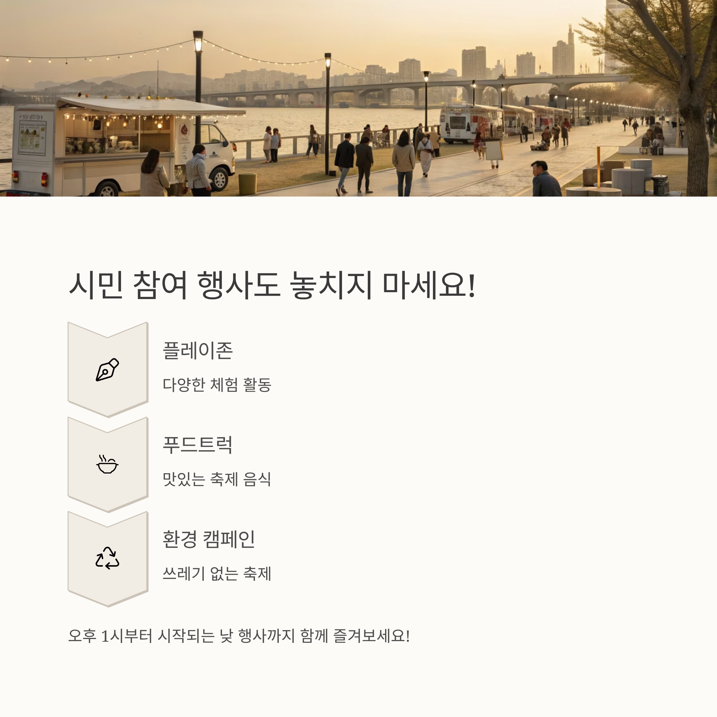 플레이존, 체험 부스, 푸드트럭 등이 한강공원 곳곳에서 운영되며, 한화의 쓰레기 없는 축제 캠페인도 함께합니다.