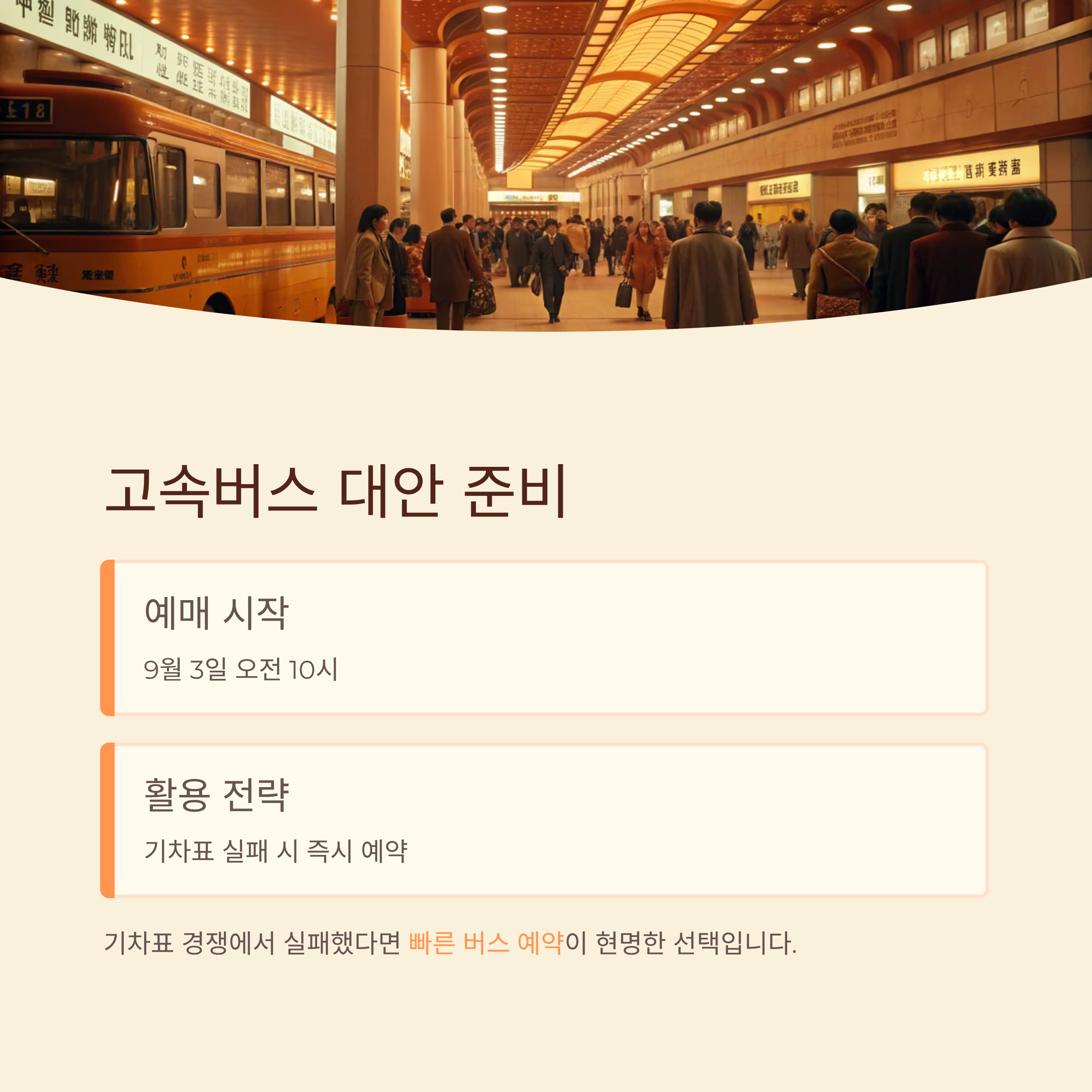 2025년 고속·시외버스 예매는 9월 3일 오전 10시부터 오픈되었으므로, 기차표를 놓쳤을 때 대비책으로 준비해두면 좋습니다.