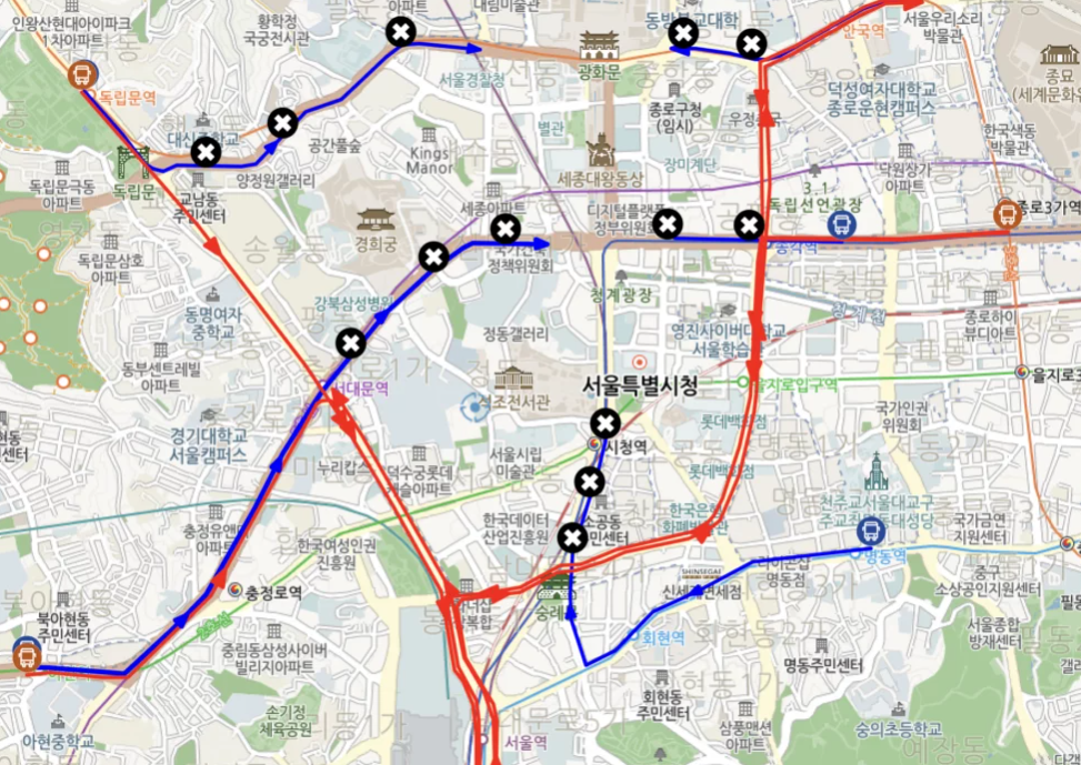 - 광화문 경유 노선 대부분 우회 또는 무정차