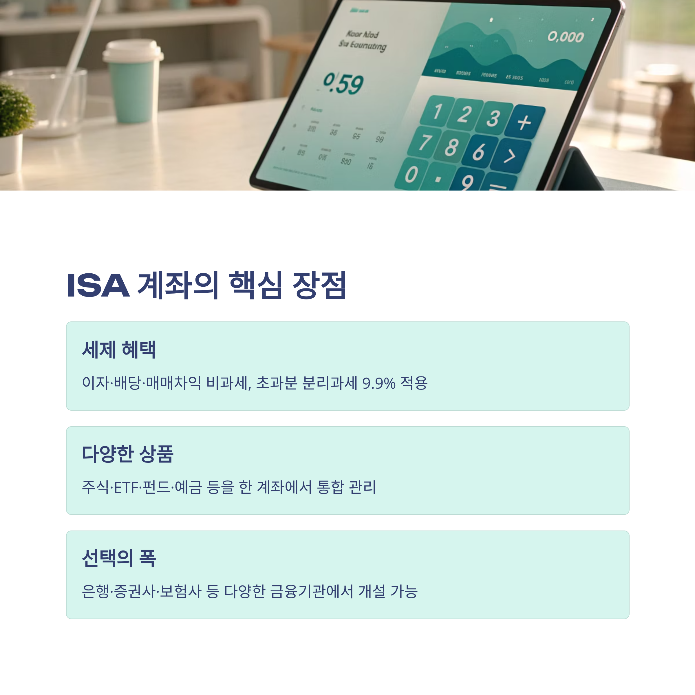 ISA의 가장 큰 장점은 세제 혜택입니다. 계좌 내에서 발생한 이자, 배당, 매매 차익에 대해 비과세 혜택과 함께 일정 금액 초과분에 대해 분리과세(9.9%)가 적용됩니다. 또 은행, 증권사, 보험사 등에서 개설할 수 있어 선택의 폭이 넓고, 주식·ETF·펀드·예금 등 다양한 상품을 한 계좌에서 관리할 수 있다는 점이 강점입니다.