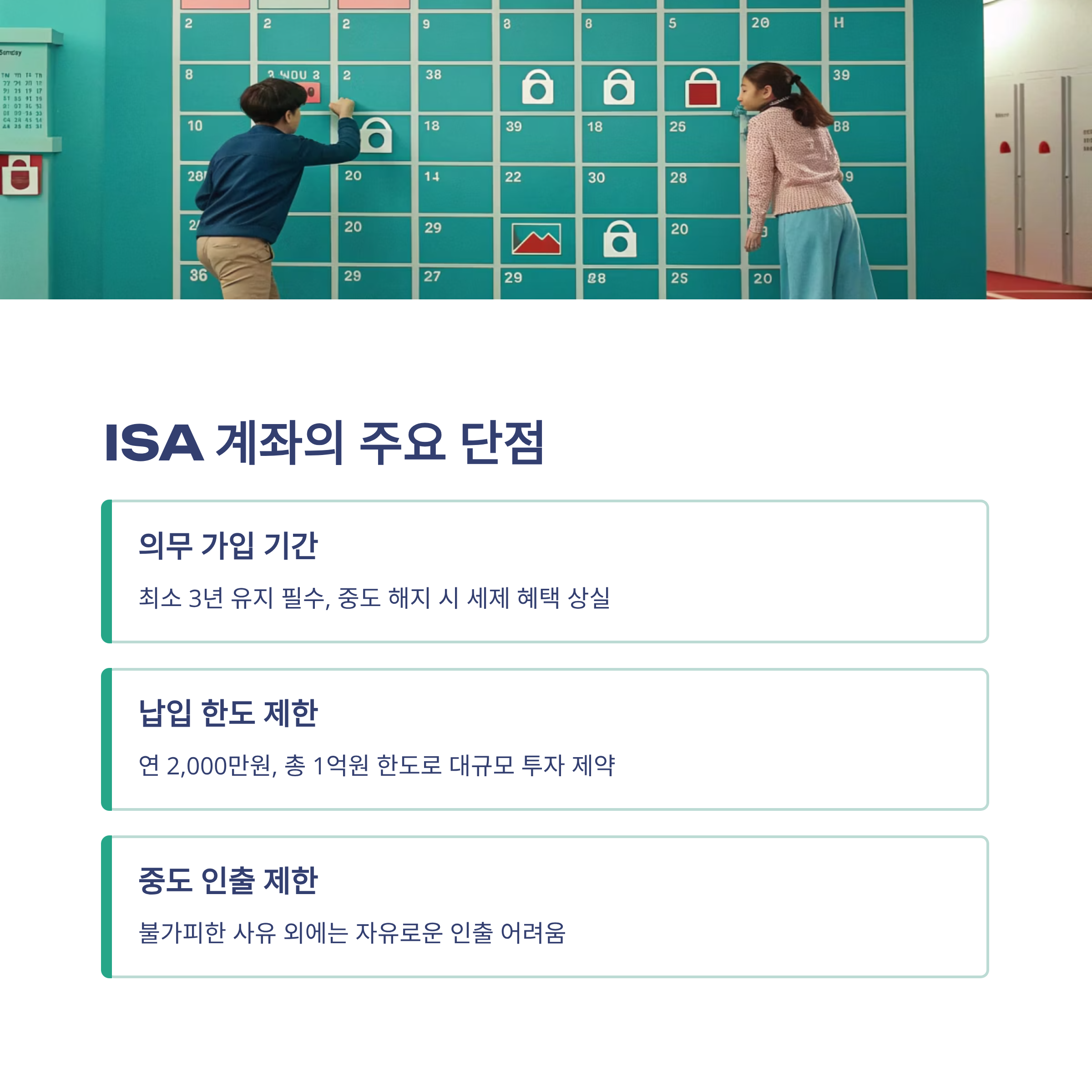 의무 가입 기간이 최소 3년이라는 점이 가장 큰 단점으로 꼽힙니다. 또한 납입 한도가 연 2,000만 원, 총 1억 원으로 정해져 있어 큰 자금을 단기간에 굴리기에는 제약이 있습니다. 중도 인출이 제한적이며, 세제 혜택을 받기 위해서는 일정 기간 계좌를 유지해야 한다는 점도 불편할 수 있습니다.